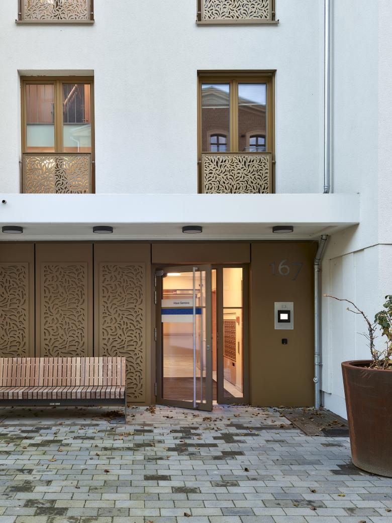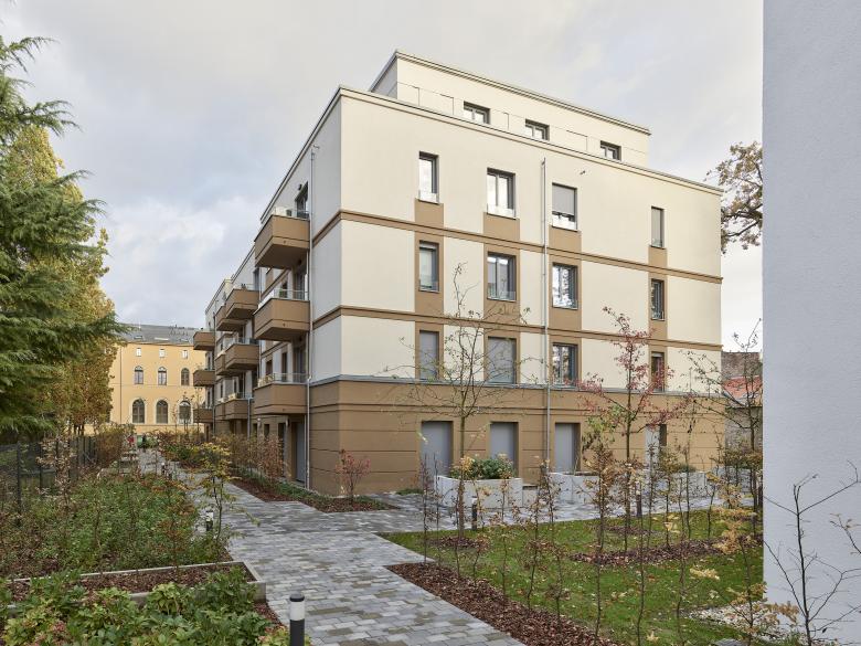 Südlich des historischen, sanierten und umgenutzten Gesellschaftshauses entstand ein weiterer Neubau, der die Geschossigkeit sowie einige Gestaltungselemente des U-Förmigen Nachbargebäudes aufnimmt. Hier sind allerdings die Gesimse flächiger gehalten. Es wurde eine monochrom weiße Farbigkeit der Putzfassaden mit farbigen Akzenten durch textilen Sonnenschutz und die Schlosserelemente gewählt. Dieser Bereich wird ausschließlich für Wohnen genutzt.