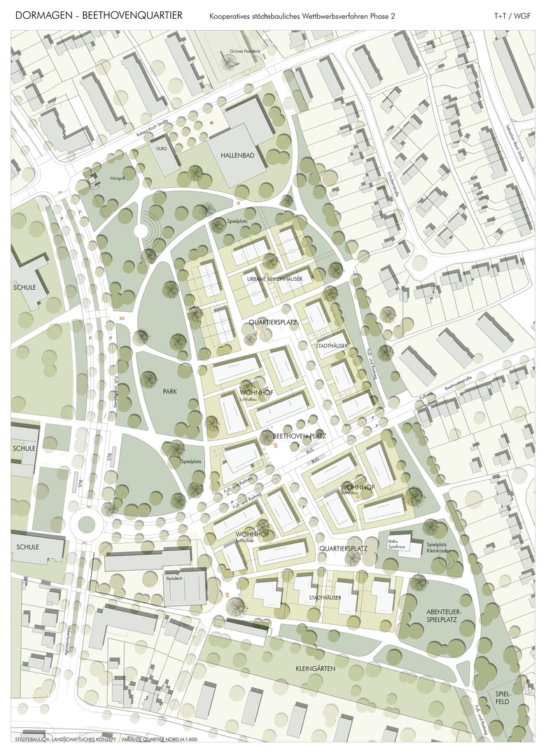 Das neue Beethovenquartier, ein von bestehenden Park- und Grünanlagen eingerahmtes „Urbanes Gartenstadtquartier“, hebt sich mit spezifischer Raum- und Baustruktur deutlich von seinem weitgehend heterogenen Umfeld ab. Das elastisch konzipierte Quartiersgefüge erlaubt aufgrund einer offenen, jedoch raumbildenden Bauweise ein hohes Maß an Durchgrünung und öffnet sich über Raum- und Blickbezüge zu den umgebenden Parkanlagen und Stadtquartieren.