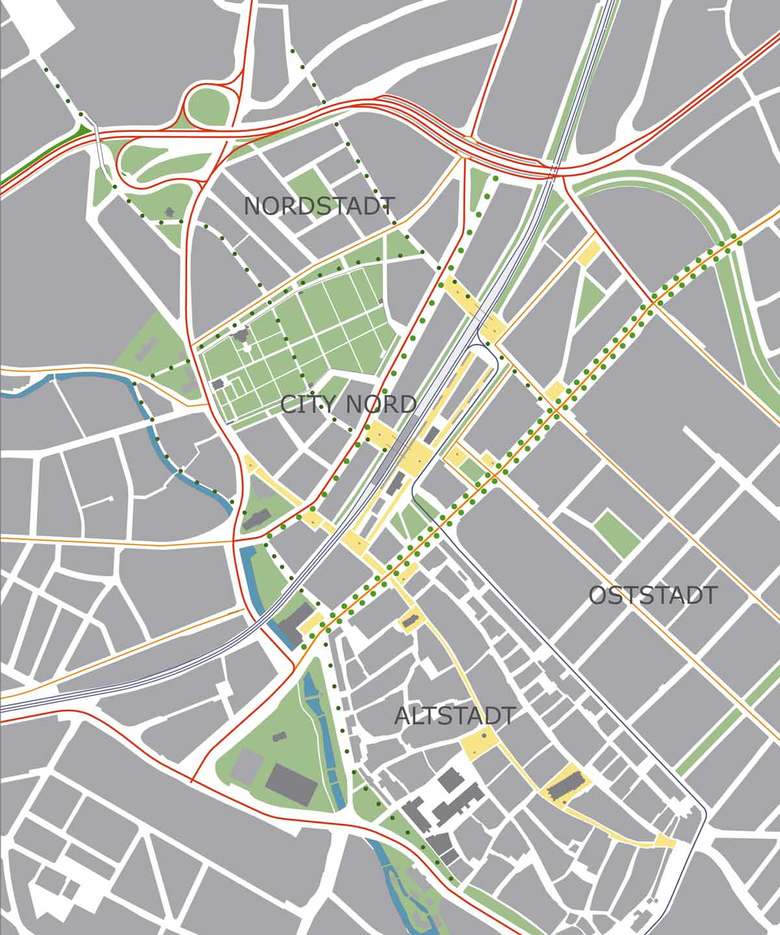 Im Gegensatz zur dichten, steinernen Altstadt mit ihrer engmaschigen Struktur und in Anlehnung an die gründerzeitlich offenere Oststadt wird die City Nord als ein urbanes und zugleich grünes Stadtgebiet definiert, in dem Topographie und Vegetation raumbildend und stadtbildprägend wirken.