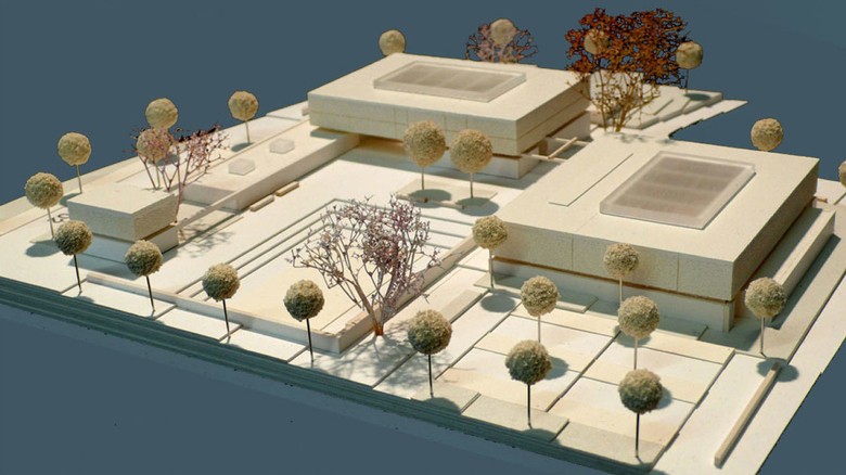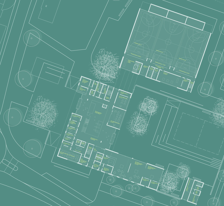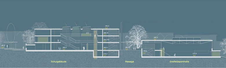 Das Ensemble von dreigeschossigem Schulgebäude und Sporthalle reagiert mit winkelartiger Baukörperanordnung und raumgreifender Geste auf die städtebaulich-landschaftsräumliche Situation am Rande von Bad Soden.