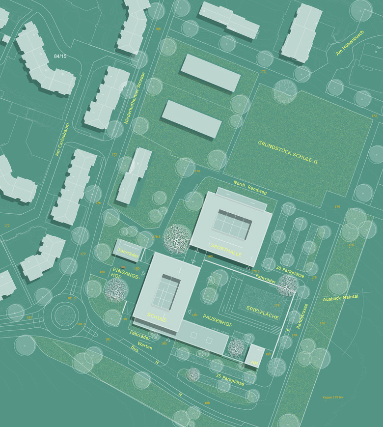 Fokus und funktionales Gelenk der Schule ist die mehrgeschossige, lichte Halle, die in einen leicht terrassierten Pausenhof übergeht, der auf den Ortsrand und den Fernblick in die Mainebene ausgerichtet ist.