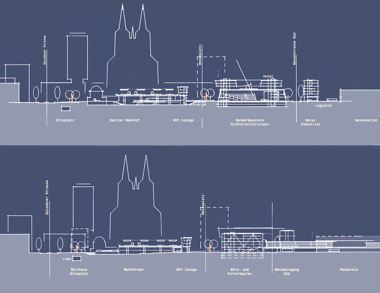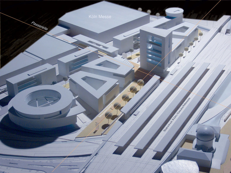 Räumlich-urbaner Schwerpunkt ist der neue Messeplatz auf der Nordseite des Deutzer Bahnhofs. Auf ihm markiert das neue Messehaus als fernwirksames Stadtzeichen die hier diagonal eintreffen-den Raumbezüge des Messequartiers. Auch mit seinen moderaten Höhenentwicklung (15 Geschosse) verankert das Solitärgebäude das Messegelände in der Stadtsilhouette, korrespondiert mit den benachbarten hohen Stadtzeichen und vermittelt andererseits zwischen den Großbausteinen des Technischen Rathauses und der Messe.