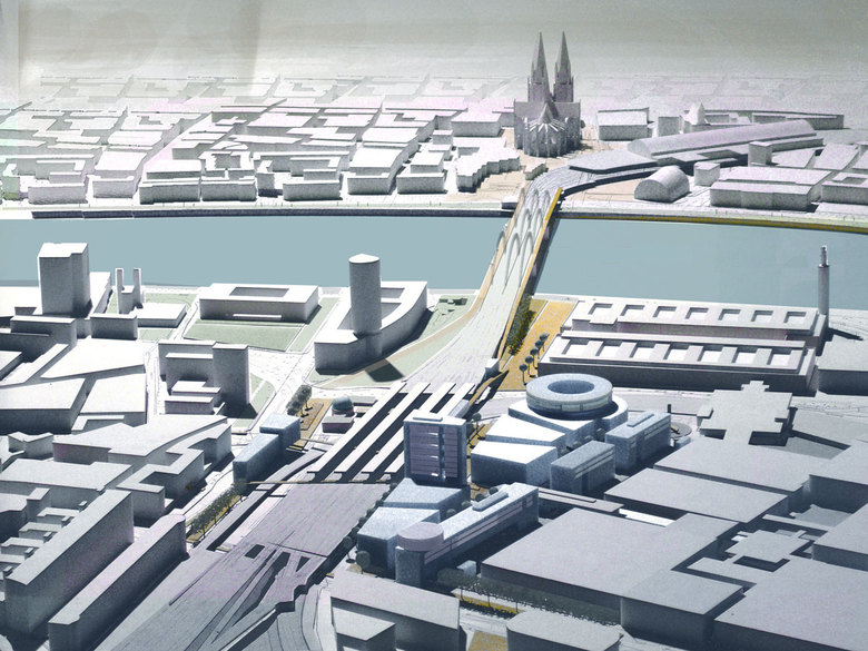Leitidee des Entwurfs ist, das neue Messequartier mit seinen Raum- und Sichtbezügen vorrangig auf das Rheinufer und die linksrheinische Innenstadt mit Dom auszurichten. Die Grundstruktur des neu-en Quartiers ergibt sich aus der Überlagerung von Raum- und Ordnungsprinzipien der Messe, der Bahnanlage sowie aus Wegebeziehungen zu den angrenzenden Stadtgebieten, die auch die Quartiersstruktur und deren lebendige Aufrichtung bestimmen.