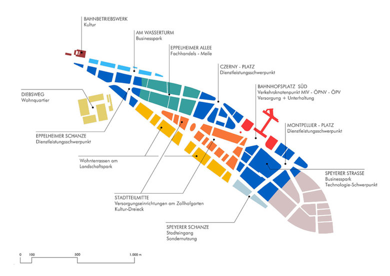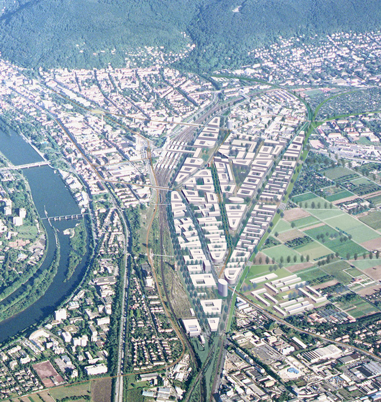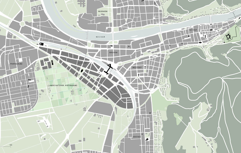 Die neue Bahnstadt entsteht auf dem ehemaligen Güterbahnareal,das von bahntechnisch-logistischen Anlagen des 19. Jahrhunderts und morphologisch auch vom ursprünglichen Verlauf des Neckars geprägt ist. Leitgedanke des Entwurfs ist, diese Spuren zu konstitutiven Ordnungselementen der Stadtstruktur zu machen. In der Übersetzung geschwungener Gleisstrassen zu Stadträumen und langgezogener spindelförmiger, teils aufgefächerter Betriebsanlagen zu Baufeldern entsteht eine spezifische Stadtfigur, die die bahntechnische Geschichte im Stadtgrundriss verankert und räumlich lesbar macht. Von Neckar und Innenstadt ausgehende traversierende Wegführungen gliedern das Stadtgefüge und stellen Raumbezüge zum Landschaftspark Pfaffengrund her. In den Schnittpunkten dieser Ordnungslinien liegen Stadtplätze unterschiedlicher Größe, Funktion und Gestalt. In dem angrenzenden Landschaftspark wird der historische Weg zum Schwetzinger Schloss, in dem alle Weg- und Sichtbeziehungen münden, wieder zur übergeordneten Raumachse.