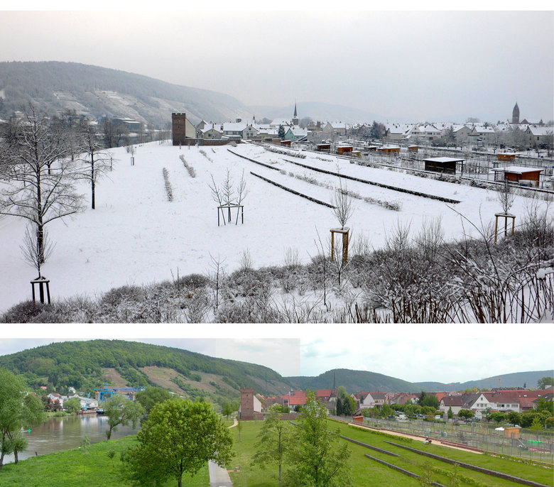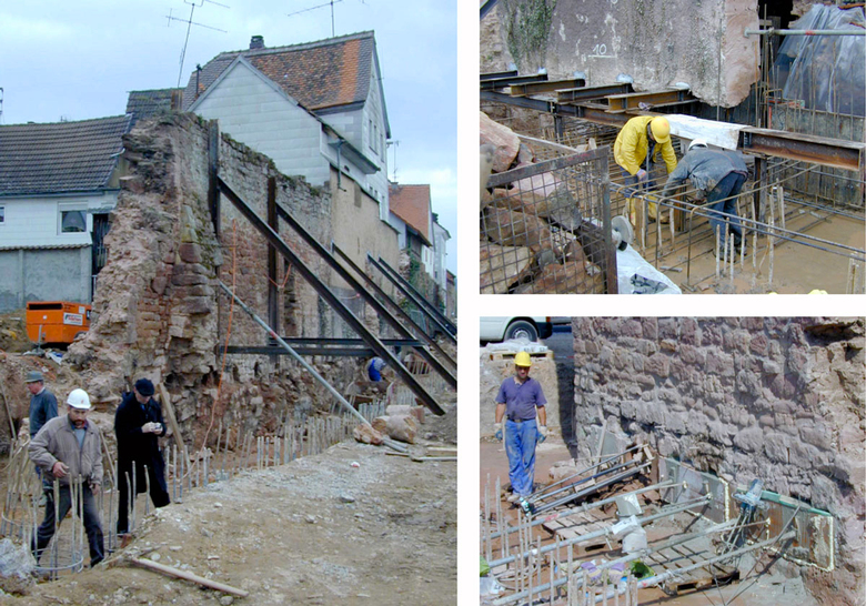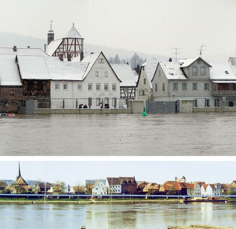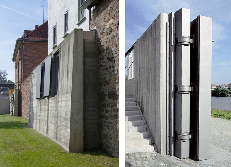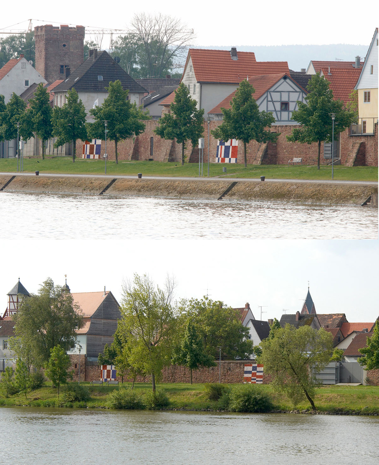 In Wörth am Main übernimmt die historische, denkmalgeschützte und konstruktiv wieder ertüchtigte Stadtmauer den Hochwasserschutz. Das neue Schutzsystem umgreift die Altstadt somit von drei Seiten.