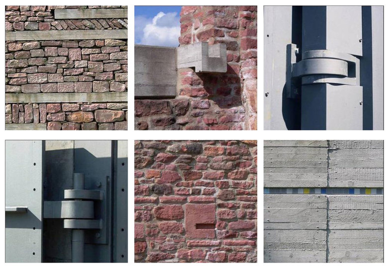Materialität und konstruktive Ästhetik der Torscharniere. Trockenmauerwerk aus gestapelten Sandsteinen und stabilisierenden Betonbalken. Ein aufgelegter Betonspeyer entwässert das benachbarte Scheunendach. In die rekonstruierte Stadtmauer eingearbeitete Fundstücke - Fragmente der Stadtgeschichte. Raue Brettschalung im Zusammenspiel mit farbigem Kachelfries.