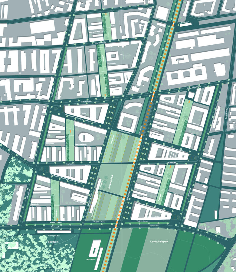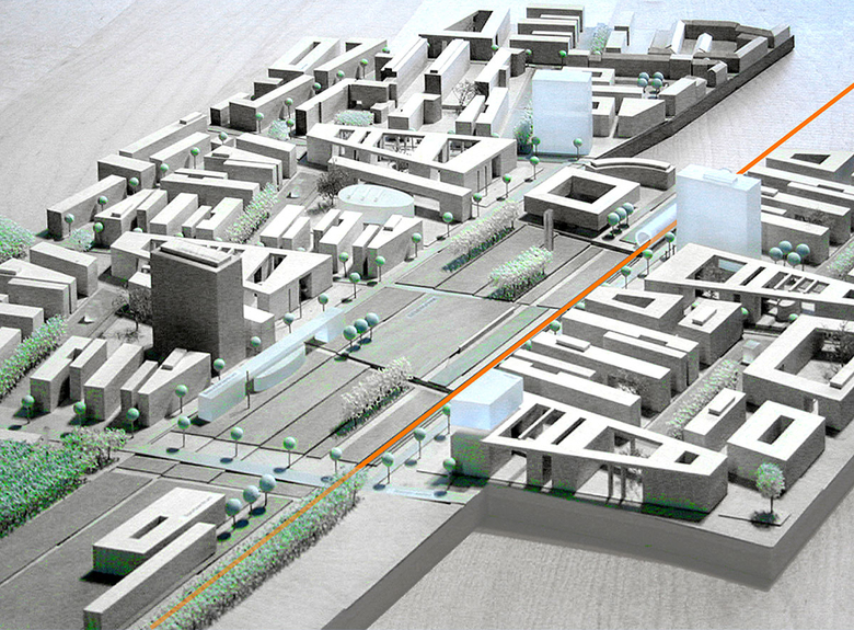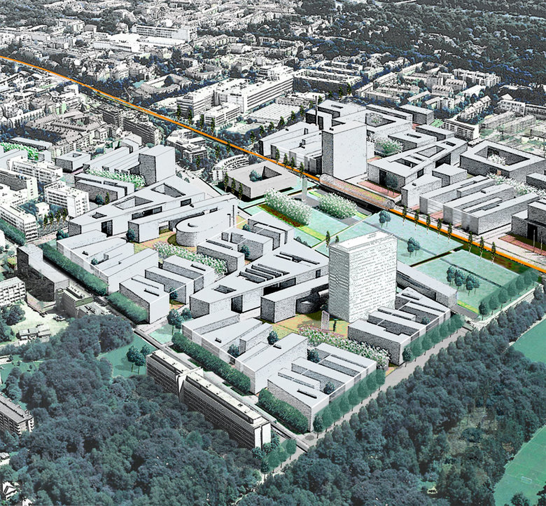 Städtebauliches Leitbild ist eine stadtintegrierte Campusanlage, das heißt ein in Stadtgrundriss und Stadtbild eigenständiges Quartier mit dem Dialog konzentrierter baulicher Dichte, großzügiger Durchgrünung, sowie Orientierung auf einen mittigen Park geprägt ist.