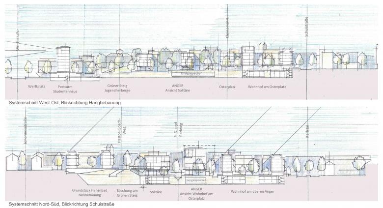 Mit einem nach Osten moderat ansteigenden Geländeverlauf passt sich das neue Quartier topografisch an die höher liegenden Stadtgebiete an, wobei die von einer Stützmauer gehaltene baumbestandene Böschung unterhalb des Pastor-Gosch-Wegs als grüner Quartiersrand und Wegführung zur Innenstadt verbleibt.