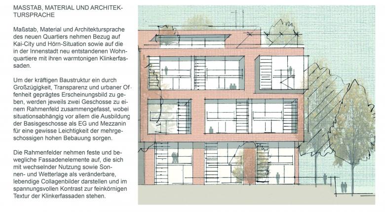 Das räumliche Konzept ist von einer sachlichen und ruhig gehaltenen Ordnungsstruktur bestimmt, die auf das gründerzeitliche Raumgefüge Gaardens antwortet und maßstäblich zur neuen Kai-City vermittelt. Zentraler Ort ist der zwischen zwei Platzräumen gespannte Anger als Freiraum und gemeinsame Adresse für die umliegenden typologisch und funktional unterschiedlich besetzten Baufelder. Neben Aufenthalts- und Freiraumfunktion hat der Anger auch ökologisch-energetische Bedeutung und korrespondiert mit dem zu einem Studentenhaus umgebauten ehemaligen Postturm, der das Quartier weithin sichtbar im Stadtbild verankert.