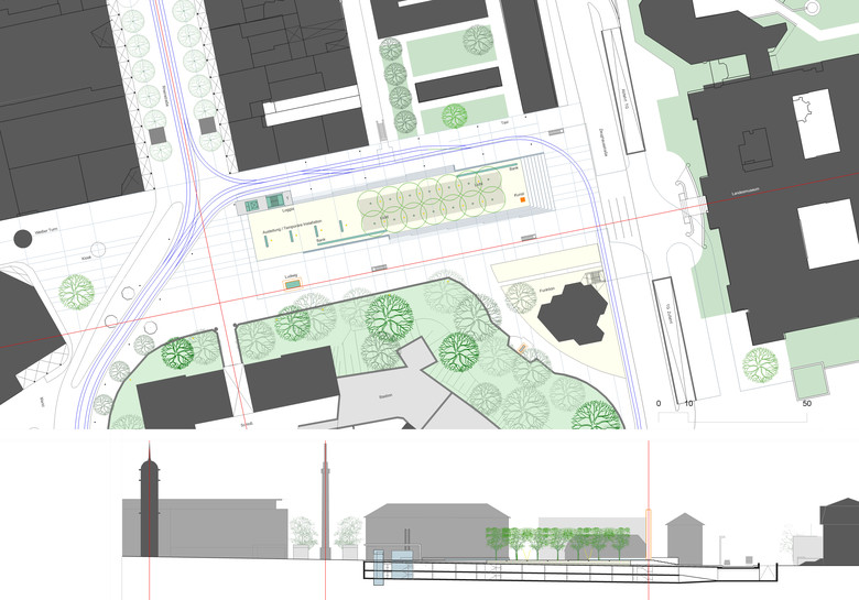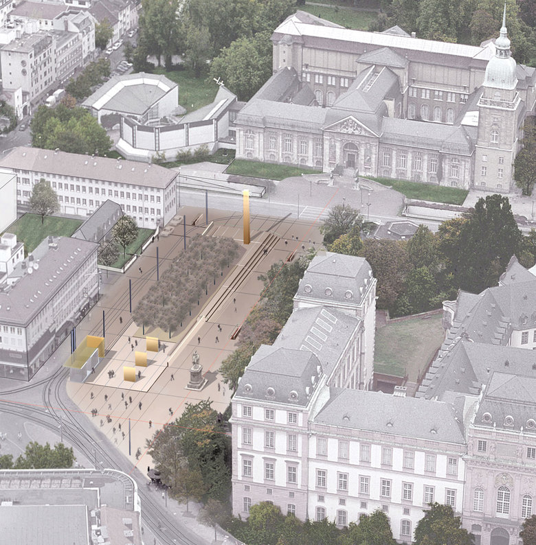 Entwurfsziel ist, die durch zahlreiche Einbauten verunklärten Raumbeziehungen zwischen Innenstadt, Schloss und dem Landesmuseum wiederherzustellen und über der bestehenden Tiefgarage einen baumbeschirmten, öffentlichen Raum als lineare ‚Stadtterrasse‘ zu schaffen, die sich im frequentierten Stadtzentrum als ruhiger Aufenthaltsbereich darstellt.