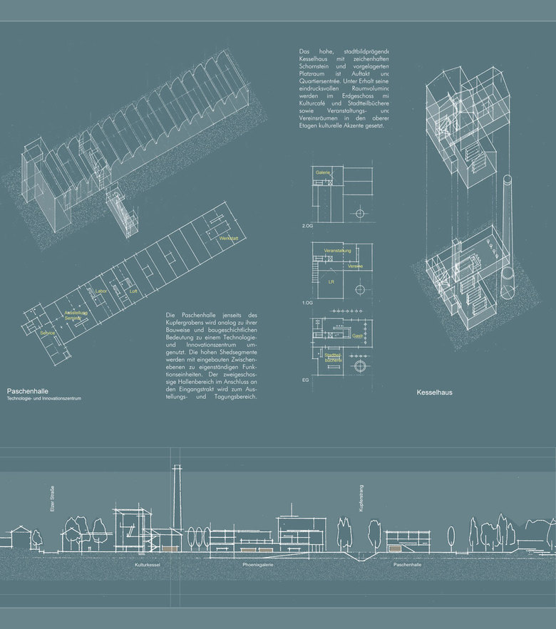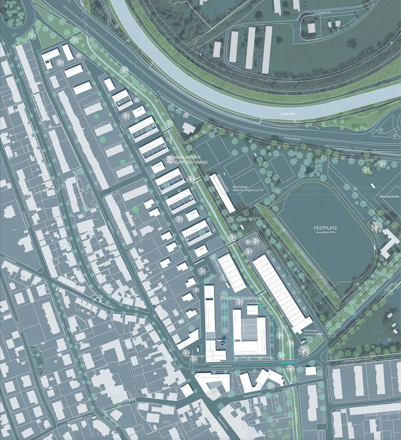 Bei der Umnutzung sind Geschichte und spezifische Identität des Ortes durch Erhalt prägnanter Raumfolgen und wichtiger Gebäude nach wie vor präsent. Die Gesamtanlage des neu geordneten Phönix-Quartiers wird in ihrer Struktur und im Erscheinungsbild auch künftig von Rationalität und Duktus der alten Industrieanlage geprägt.