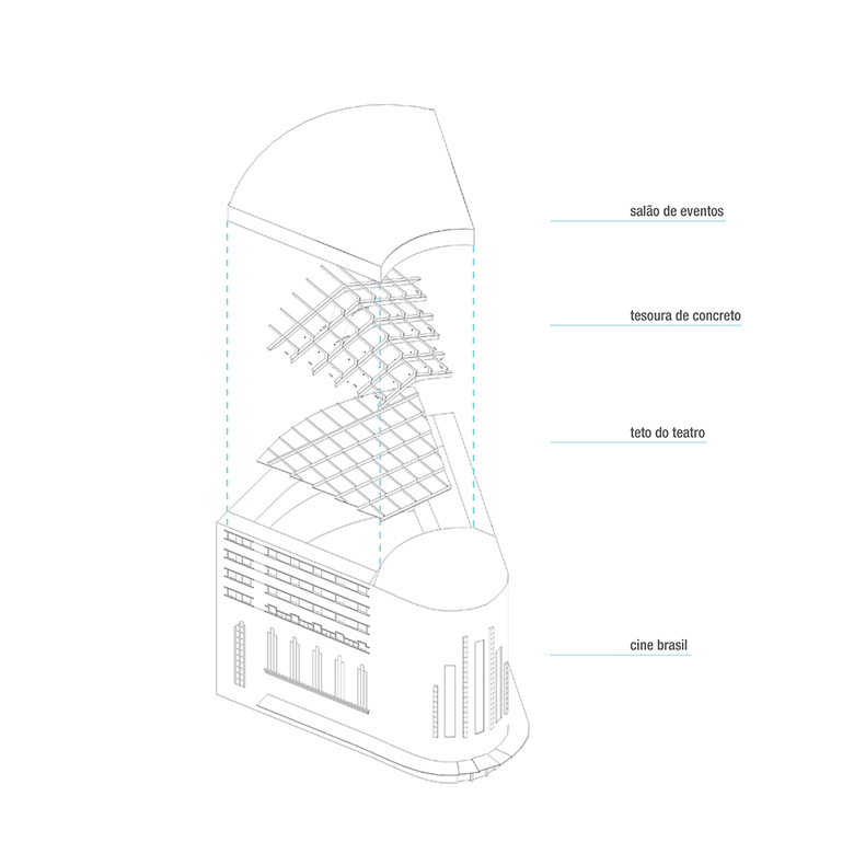 In a recent convertion of the cinema into a cultural center, a ballroom was built above the old roof, which generated a great architectural void between the sloped ceiling of the audience and the slab of the new ballroom. Within this void, the original concrete framework of the roof that once covered the original building has been preserved.