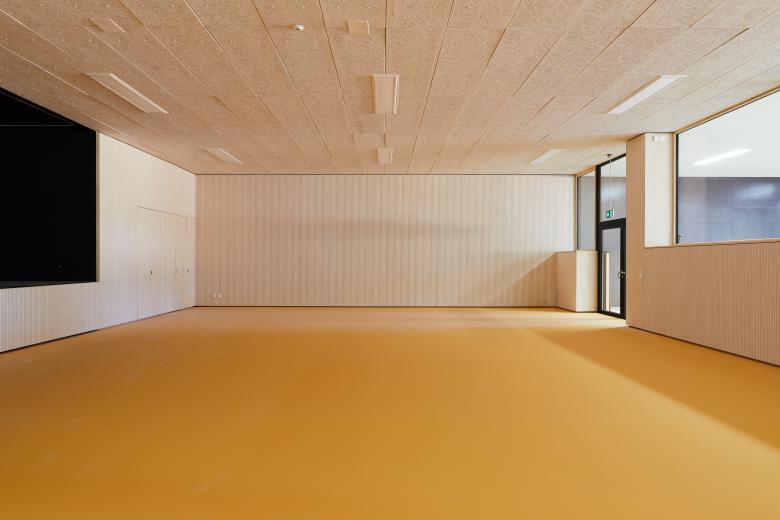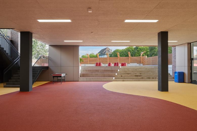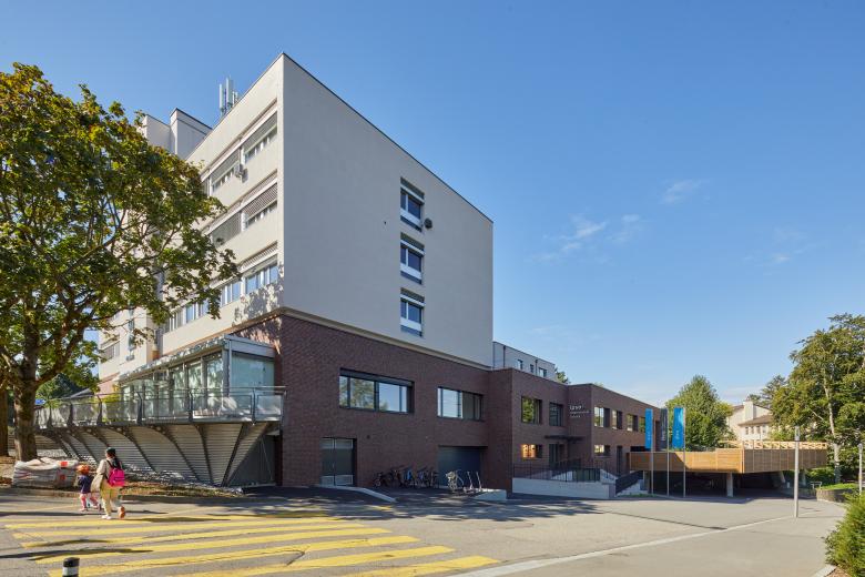 Als ein neues ortsprägendes Element wird eine Terrasse Richtung Sportplatz mit einer bewachsenen pergola-artigen Brüstung gestaltet – als Kombination dient die Terrasse als überdeckte Vorfahrt der internationalen Schule. Die ehemaligen Autoeinstellhalle öffnet sich im vorderen Teil und ermöglicht einen grosszügigen gedeckten Aussenbereich. Die Umgebung wird auf 3 Seiten komplett neugestaltet und naturnah mit Spielflächen ausgebildet.