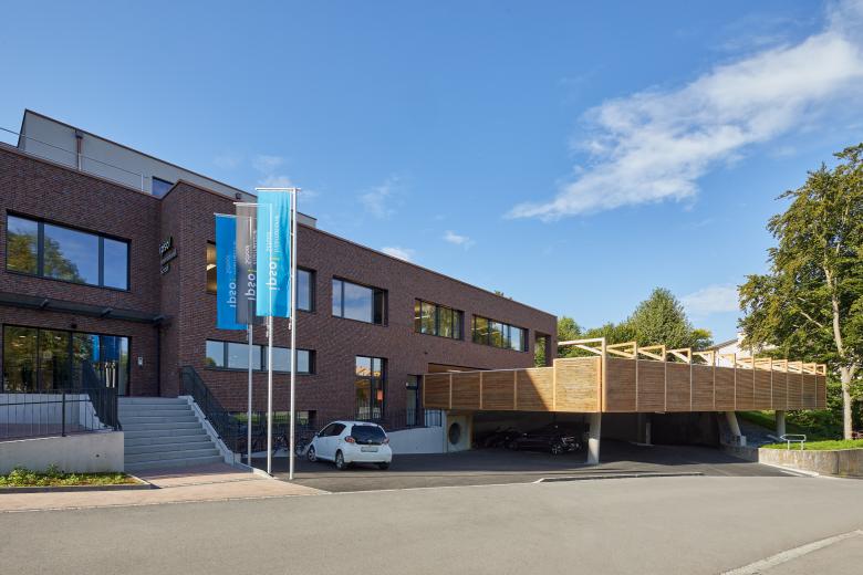 Die Fassaden im Erdgeschoss und die der beiden Untergeschosse bekommen eine energetische Sanierung und ein Kleid aus Klinker-steinen. Alle bearbeiteten Geschosse erhalten grosszügige neue Fenster und Öffnungen. Die ehemalige Bäckerei beherbergt nun neue Schulräume mit einem fantastischen Weitblick über die Altstadt von Rheinfelden. Gesamthaft kann die Schule nun eine KITA und alle Jahrgänge bis zur Sekundarschule in einem Haus anbieten. Daneben werden direkt an der Bahnhofskreuzung Gewerbe- oder Büroflächen im Rohbau zur Miete angeboten.