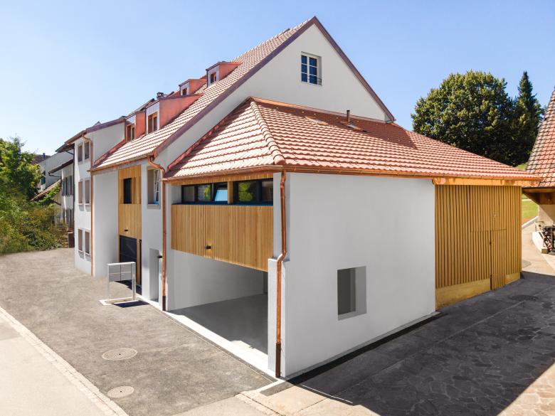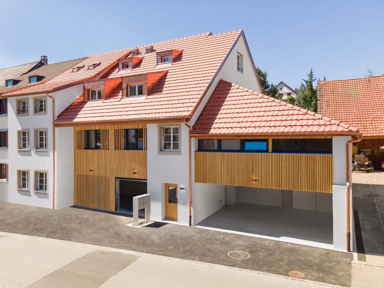 Das bestehende, zum Ortskern gehörende Haus, wurde bis auf sei-ne Aussenmauer abgebrochen und neu erstellt. Das Mehrfamilien-haus wahrt die charmante Fassade zur Strassenseite, bietet auf der Rückseite ansprechende Aussenflächen und überzeugt mit einem modernen und zeitlosen Innenausbau. Insgesamt entstehen vier Wohneinheiten mit 3.5 bis 4.5 Zimmern. Zwei Wohnungen befinden sich im Obergeschoss mit Zugang vom Balkon in dem privaten Gartenanteil. Zwei weitere Einheiten werden als Maisonettewohnungen im Dach-/ Dachspitzgeschoss ausgebaut und verfügen ebenfalls über je einen überdachten Balkon. Im Erdgeschoss des Hauses befinden sich die Bewohner- und Besucherparkplätze, die Kellerräume sowie zwei Hobbyräume.