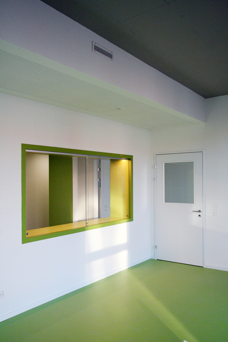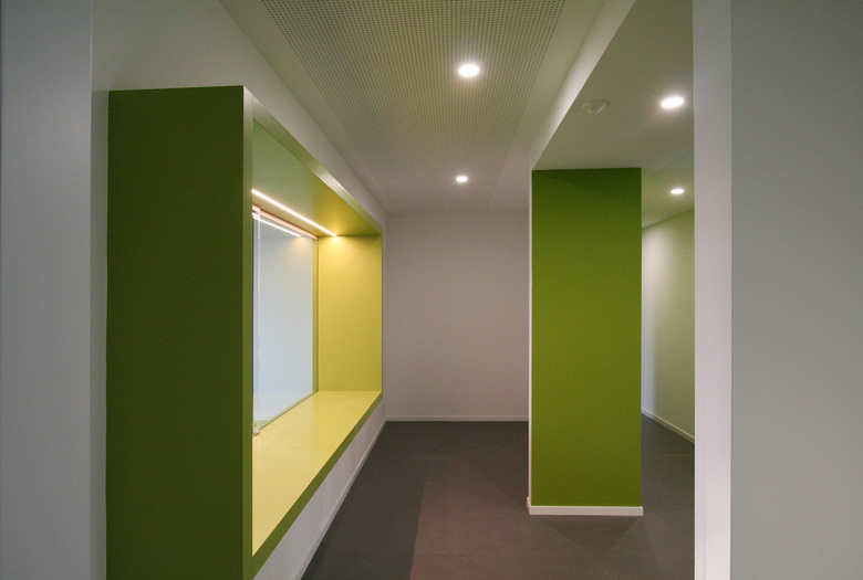 Der Betrieb des PDAG erfordert viel Stauraum für gemeinsam genutzte Ressourcen. Für die primäre Nutzung wurden 15 Therapieräume und 2 Gruppenräume realisiert. Der Korridor wurde mit Ni-schen ausgebildet, welche farblich abgesetzt sind, um den langen Korridor zu animieren. Dies war uns wichtig, da alle Fenster durch die Büroräume genutzt werden.
