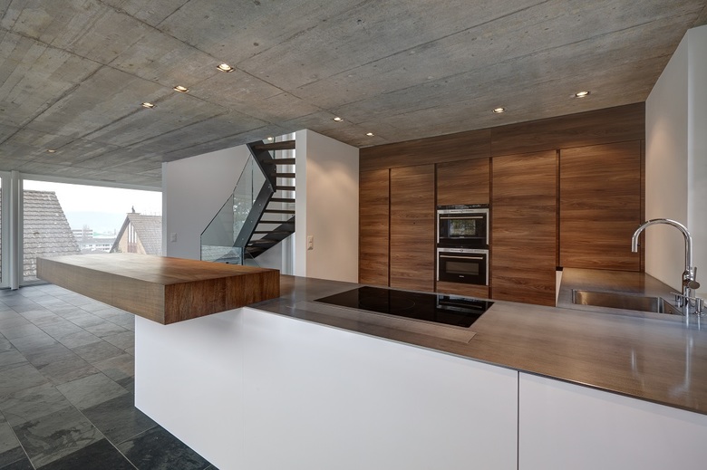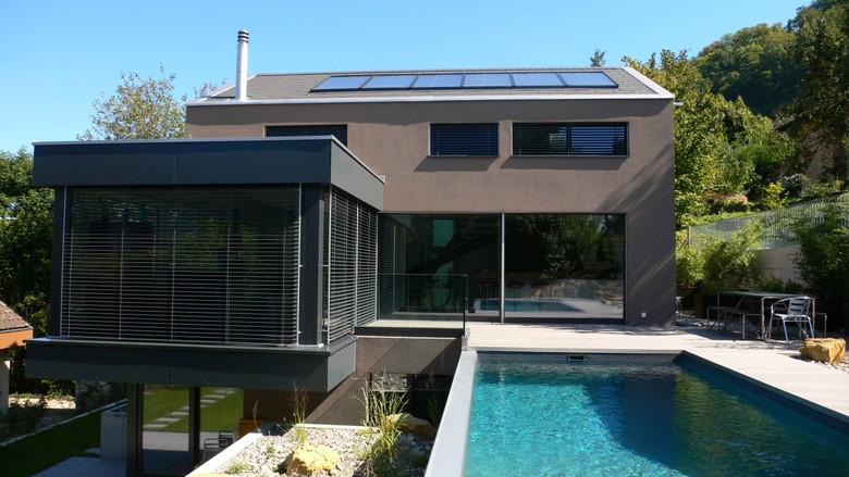 Am Fusse des Wartenbergs entstand ein Einfamilienhaus im Minergie® - Standard mit beheiztem Pool, sowie einer Doppelgarage. Um das Haus fliesst eine grosszügige Gartenanlage. Das Gebäude besticht mit seinen eleganten kubischen Formen und der modernen Materialisierung wie Schieferboden, Sichtbetondecken, raumhohe Glasfronten, Glasgeländer und der Chromstahlküchenabdeckung. Als Gegenpol führte man sämtliche Zimmerböden, sowie die massangefertigten Badezimmermöbel, in Nussbaumholz aus. Die Umgebung wurde durch die Hanglange terrassenartig in drei Ebenen eingeteilt. Man achtete darauf, dass möglichst alle Flächen horizontal verlaufen und ein harmonisches Zusammenspiel mit Pool und Küche entsteht. Bei der Bepflanzung wurde auf heimische Pflanzen, wie die Hainbuche und Magerwiese oder Rasen, gesetzt. Die Hauptterrasse wurde aus kunstoffvergüteten Holzdielen erstellt.