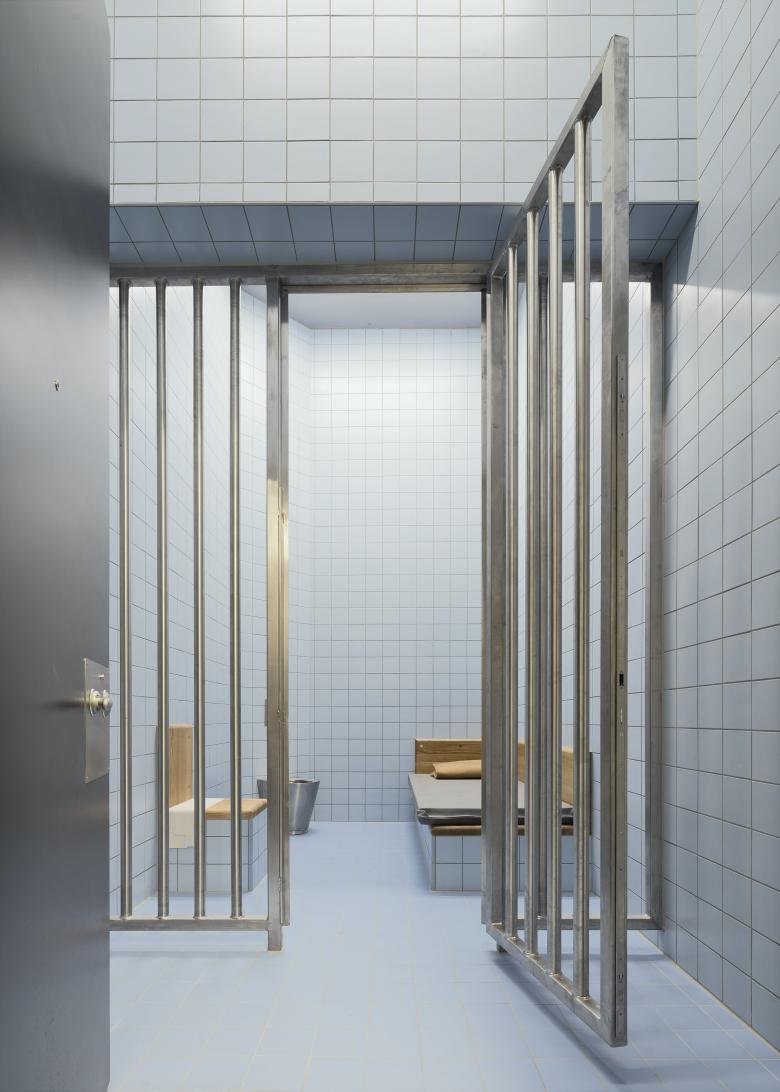 Die Fassade wird von horizontalen, über Eck laufenden Fensterbändern und messingfarbenen Lamellen gegliedert. Durch das Zusammenspiel der horizontalen Fassadenstruktur mit dem vertikal verlaufenden Rillenputz in Nachtblau entsteht das charakteristische und zurückhaltende Erscheingungsbild des Polizeiämtergebäudes.