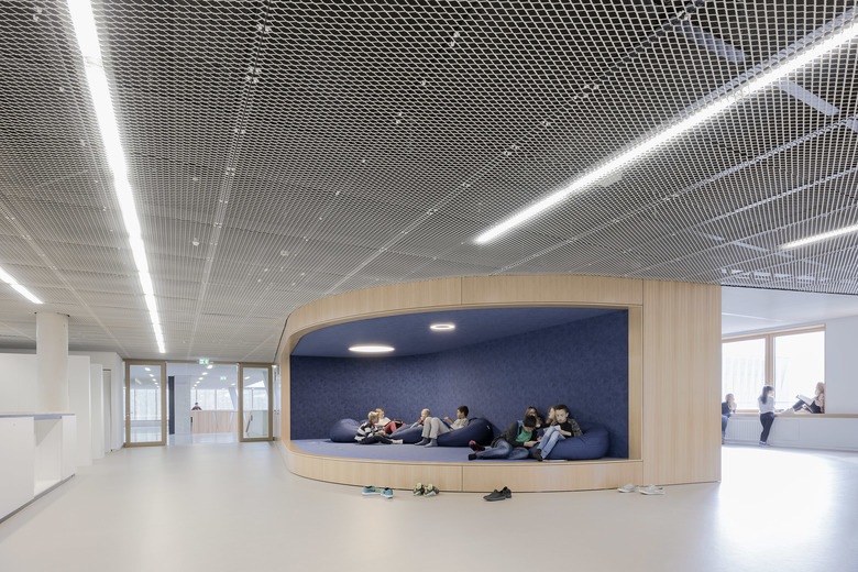 Die Sonderbereiche in den Fluren oder im Erdgeschoss sind bewusst transparent entworfen. Damit wird einerseits die baukörperliche Figur artikuliert, andererseits auch im Inneren ein sinnlicher Kontrast zwischen der „Klasse“ und den „Verkehrs- und Gemeinschaftsflächen“ entwickelt. Für jeden Jahrgangsbereich wurde ein „Lesepodest“ entwickelt, das den flexibel nutzbaren Bereich zwischen den Klassenräumen räumlich zoniert und einen Rückzugsort im Forum schafft.