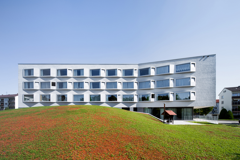 Das X-förmig gestaltete Pflegeheim korrespondiert mit den Raumfluchten der versetzt angeordneten Nebenstraßen, die direkt auf das Grundstück zulaufen. Dadurch entsteht eine prägnante räumliche Fassung, die einen geschützten Eingangs- und Gartenhof ausbildet. Der Mehrwert für die Bewohnerzimmer entsteht durch die aufgeklappten Erker: Diese bieten nicht nur mehr nutzbare Fläche, sie stärken zudem die räumlich-atmosphärische Wirkung im Innern und treten nach außen plastisch aus der Fassade.