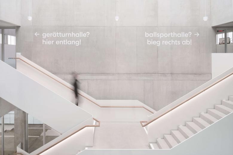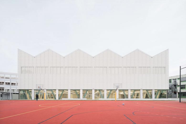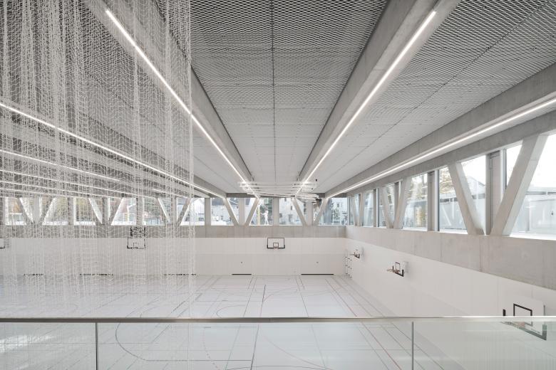 Mit der Fassade aus weißem Streckmetall präsentiert sich das Sportzentrum als eleganter Solitär. Das markant gefaltete Hallendach strukturiert den Baukörper und vermittelt zu den benachbarten, kleinmaßstäblicheren Wohnbauten. Somit fügt es sich in die Dachlandschaft ein und erhält zugleich einen hohen Identifikationswert. Im Inneren sind Sichtbeton und weißes Streckmetall prägende Materialien. Großzügige Verglasungen versorgen das Gebäudeinnere mit Tageslicht und tragen zur hohen Aufenthaltsqualität bei.