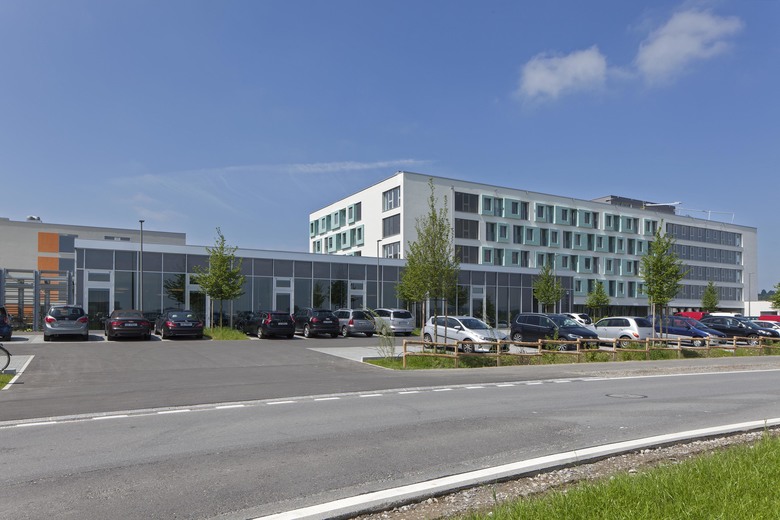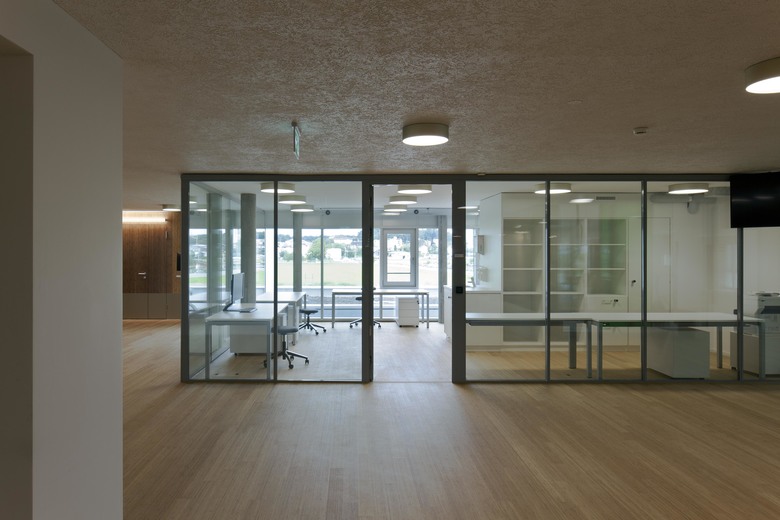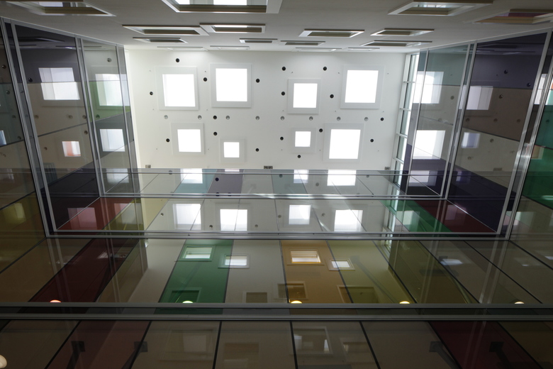 Der Eingang ins Pflegeheim, der unter einer gedeckten Vorfahrt liegt, führt über eine grosszügige Eingangshalle mit einem Innenhof zu den Lifts und zur Treppe. Die Halle ist stützenfrei.