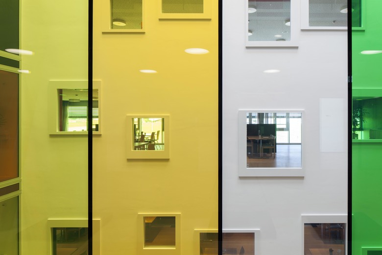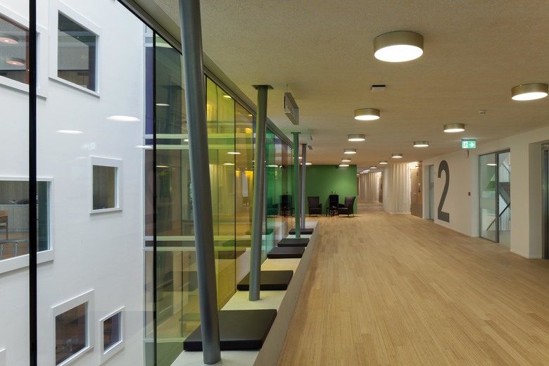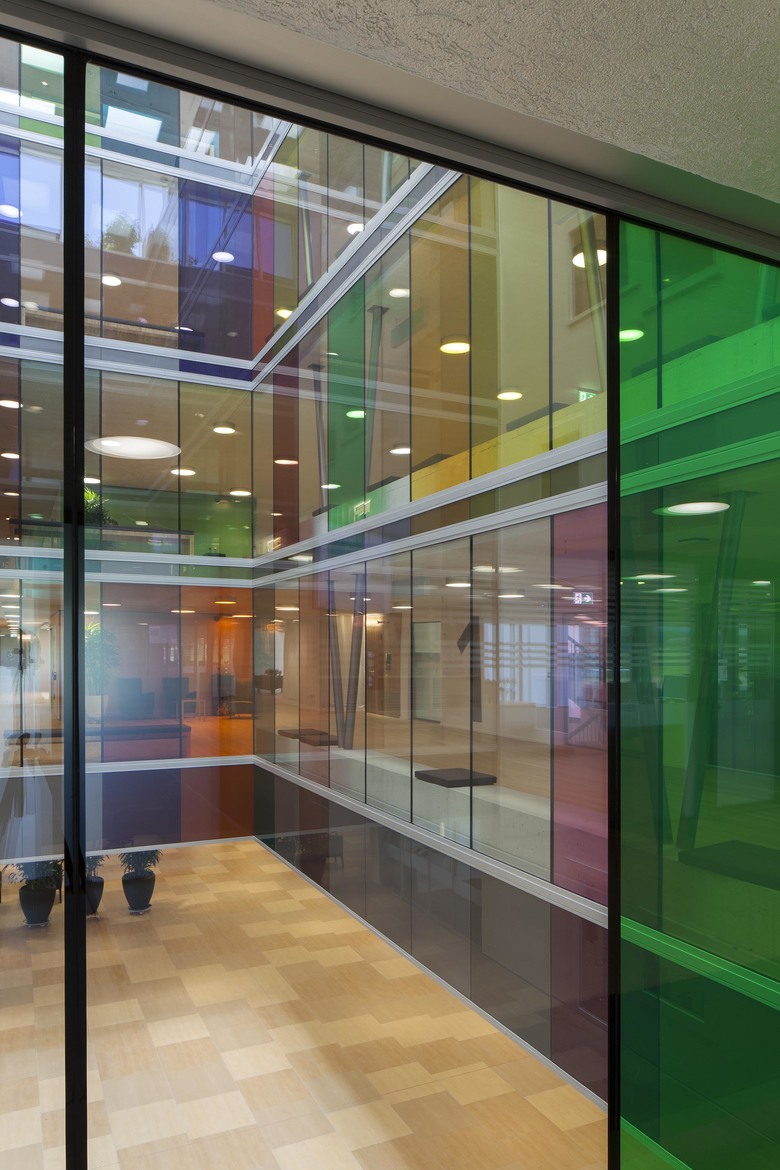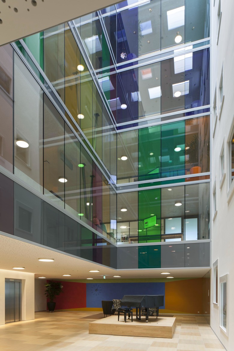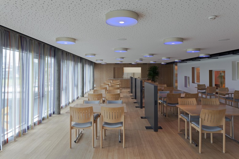Die Regelgeschosse verfügen über je eine Station mit zwei Gruppen. Verschiedene Raumausweitungen bieten Nischen für Sitzgruppen in verschiedenen Himmelsrichtungen. Der zentrale Lichthof über der Eingangshalle ermöglicht eine innere Orientierung, gibt vertikale Einblicke in die anderen Wohngeschosse und führt das Tageslicht ins Erdgeschoss.