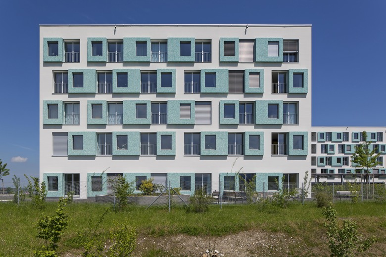 Die Farbe und Körnung der Fassade gehört zum Gestaltungskonzept des Künstlers Peter Roesch. Felder mit Kleinmosaiken bilden einen wichtigen Bestandteil des äusseren Erscheinungsbildes. Es entsteht ein Spiel mit der stumpfen, matten Fassadenfläche und den schillernden Mosaikflächen im Zusammenhang mit den Fensterfeldern.