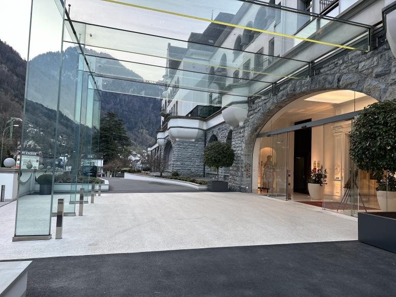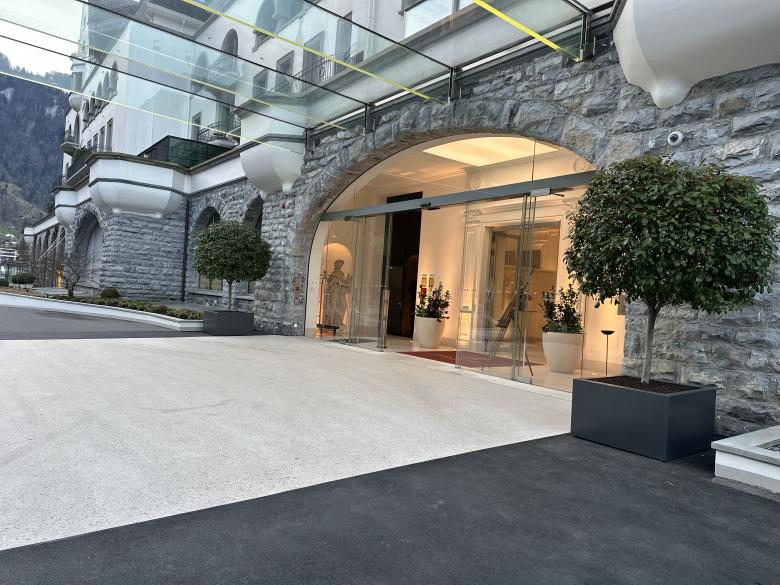 Der Oberflächenfinish wurde nach dem Einbau mittels mehrmaligem Schleifen erreicht und verwandelt den eingebauten Gussasphalt in ein Kunstwerk. Der eingebaute BituTerrazzo® besticht nach dem Schliff durch seinen rötlichen Kornanteil, welcher diesem den nötigen Kontrast zum weissen Farbton gibt. Ähnlich dem inneren des Park Hotels. Mit dem verantwortlichen Hotelpersonal wurde zuallerletzt eine kurze Schulung für den Unterhalt und die Reinigung des Belags durchgeführt. Denn Nichts ist für jede Art von Belag wichtiger als deren Pflege. Mit dem BituTerrazzo® empfängt das Park Hotel Vitznau zukünftig seine Gäste auf einem exklusiven Bodenbelag der Walo, welcher durch Dichtigkeit, Härte, aber auch die nötige Flexibilität besticht. Diese ganzen Eigenschaften gepaart mit Ästhetik machen ihn unschlagbar.