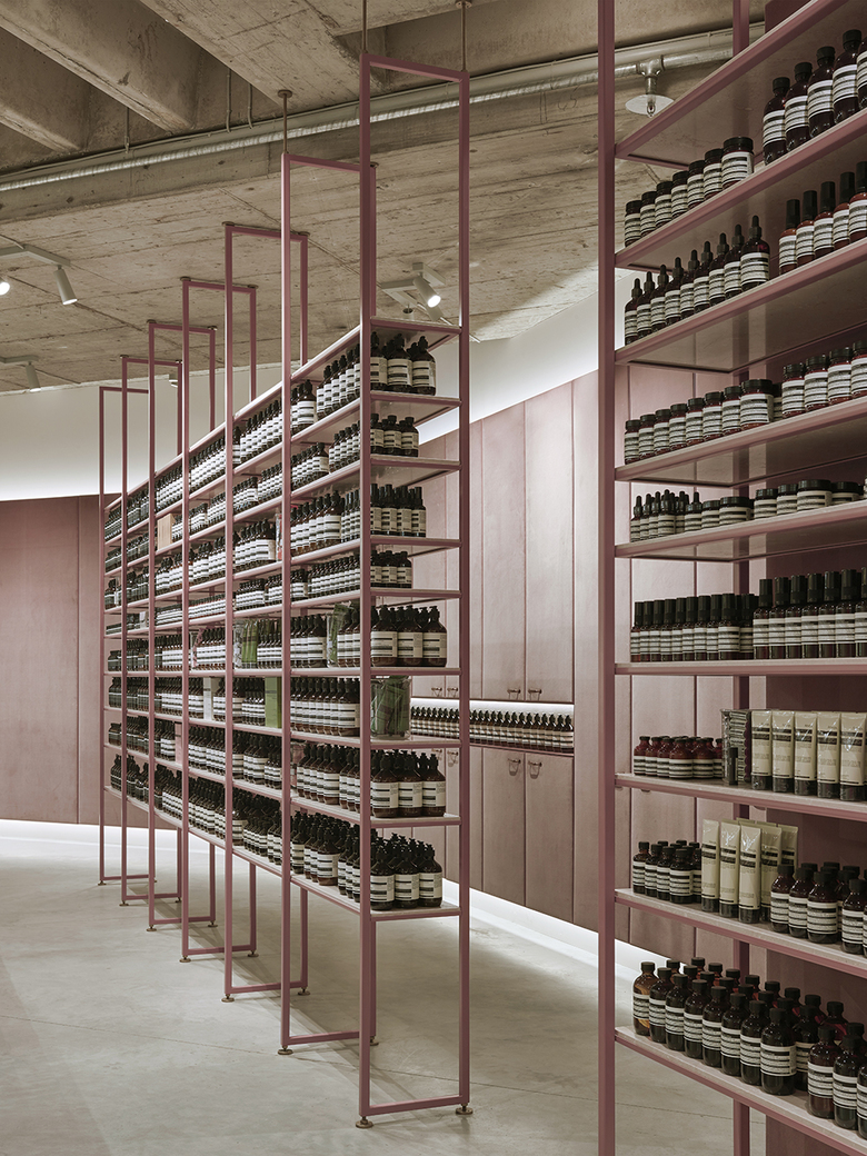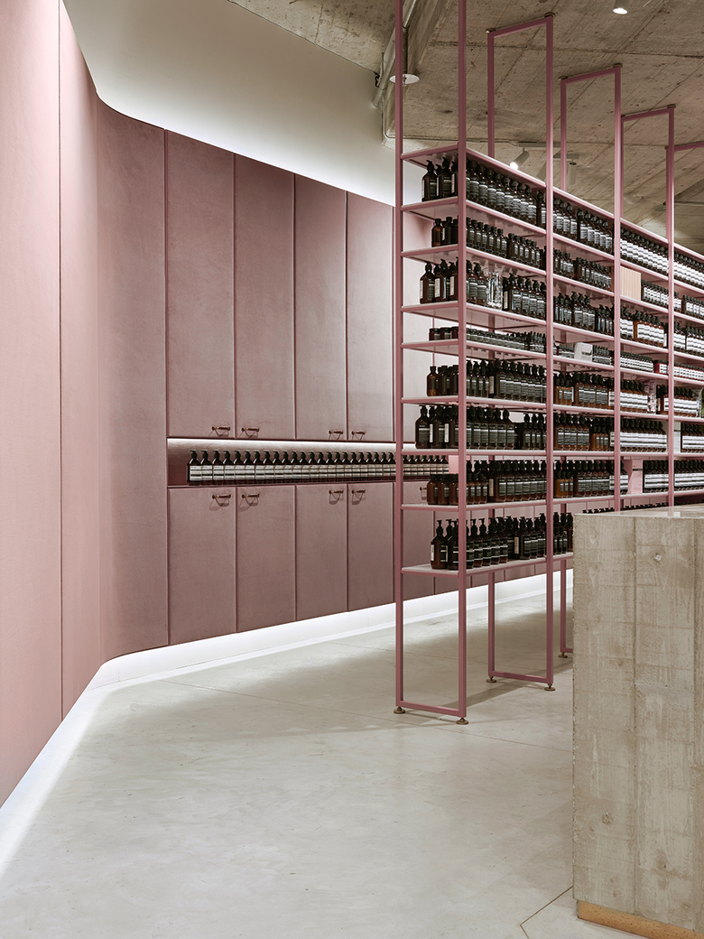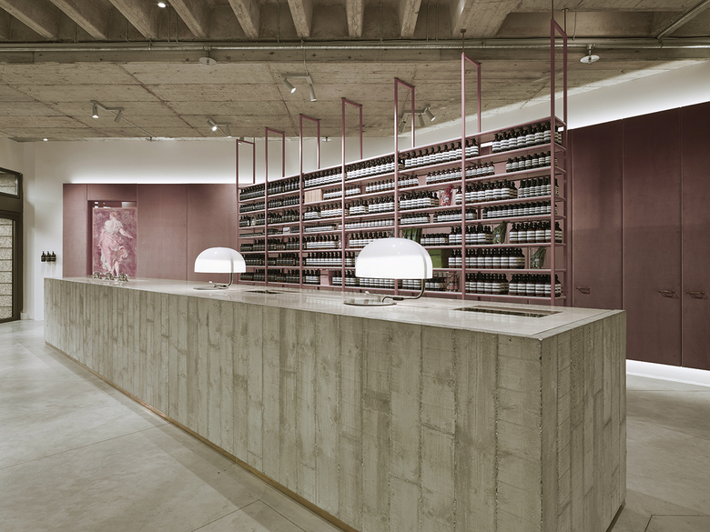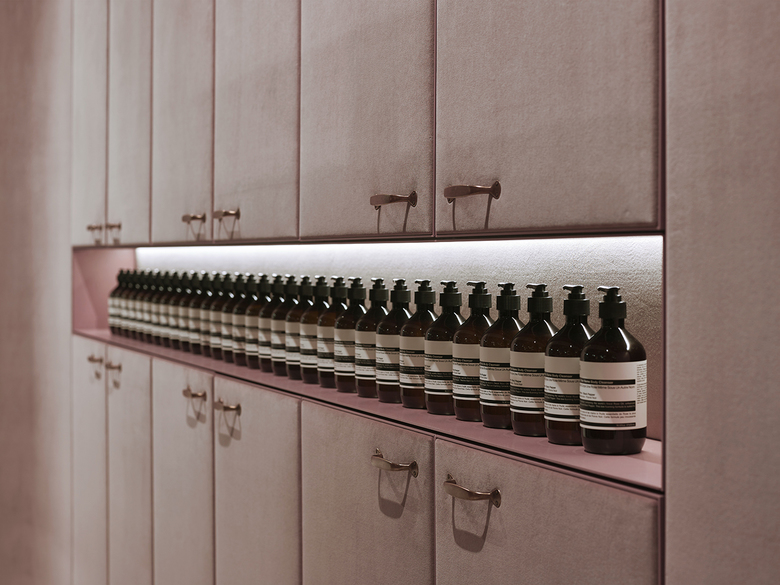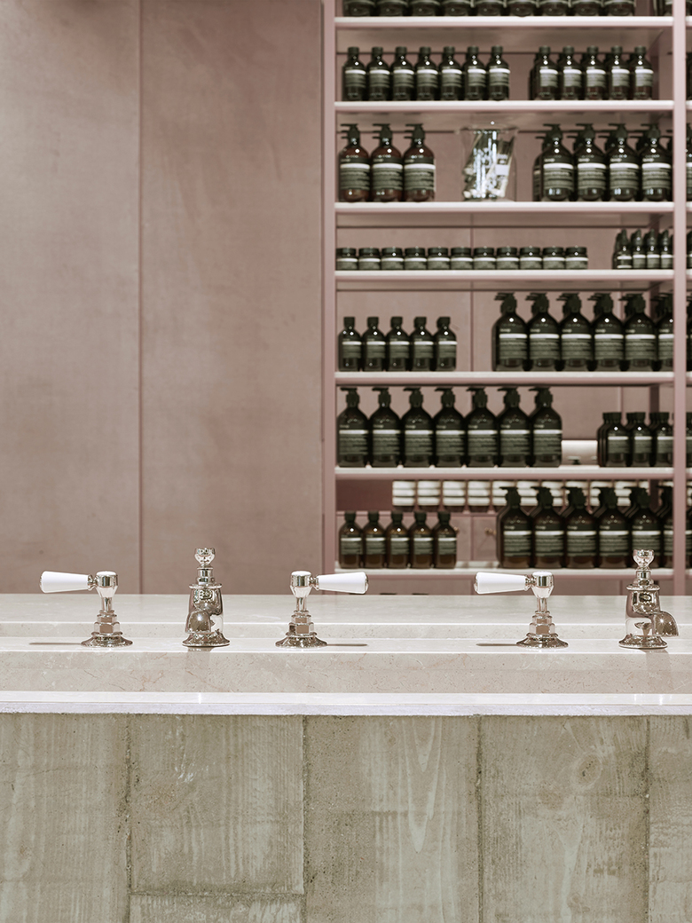 Die Samtoberflächen der Rückwand des Raumes reflektieren die Beleuchtung der Stores je nach Standpunkt und Lichteinfall immer neu. Glänzende Wasserhähne, das Ticken einer alten Uhr und das Gemälde einer Weiblichen Figur runden die Raumwirkung ab und lassen den Besucher in eine unmerklich spannungsvolle, wohltuende Ruhe des Aesop-Stores eintauchen.