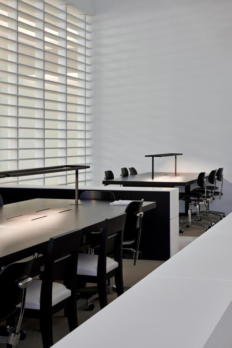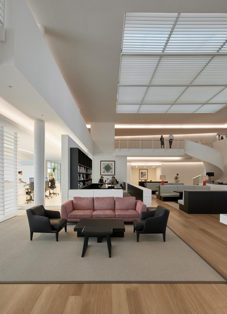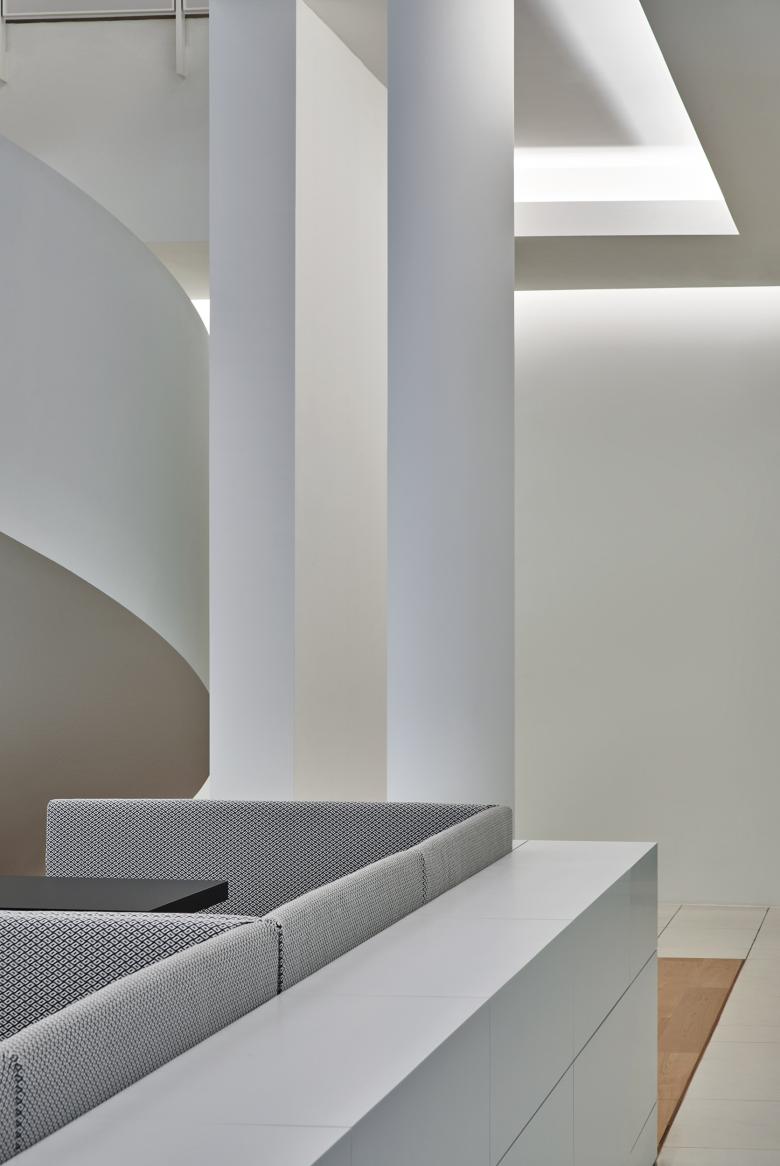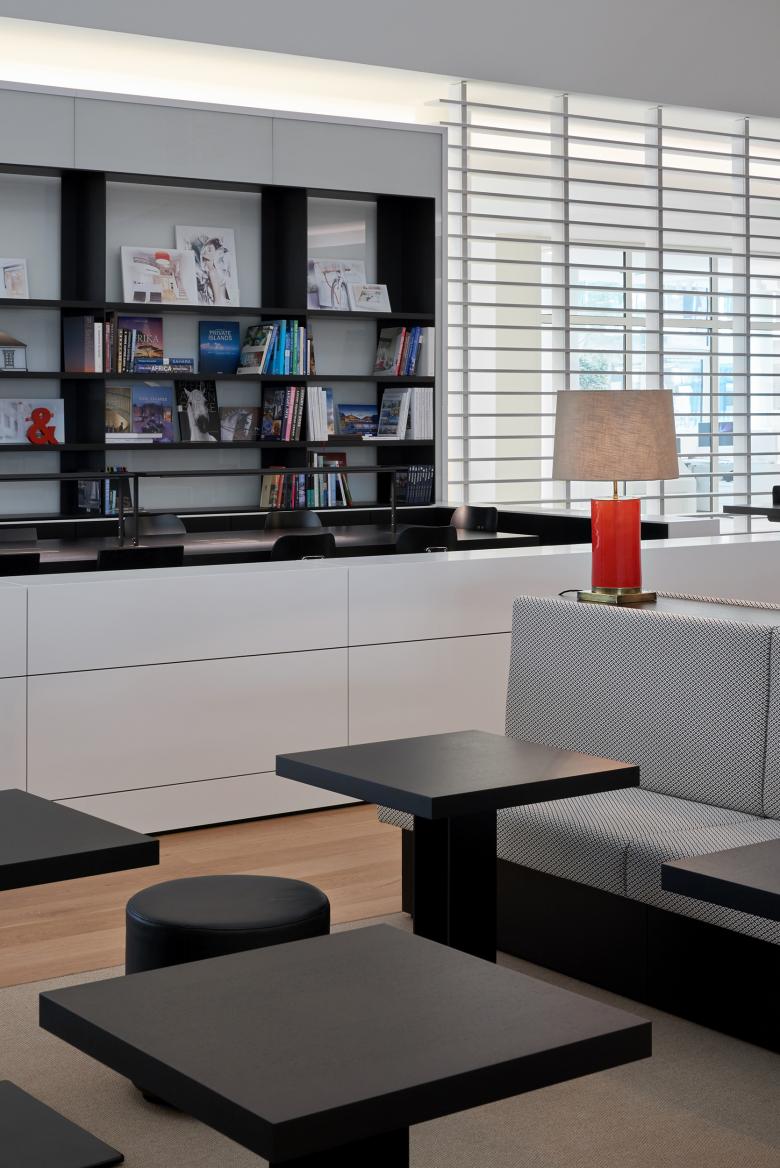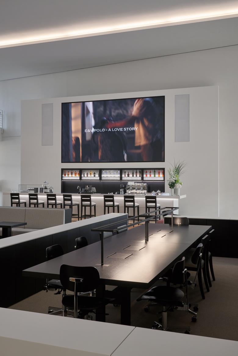 A spacious atrium in Engel & Völkers’ Hamburg headquarters hosts a hybrid between a co-working space and an exclusive hotel bar. Several islands subdivide the space into designated areas for focused work, meetings and afterwork drinks. White Corian balustrades bridge Richard Meier’s architecture with Engel & Völkers’ red and black brand signatures.