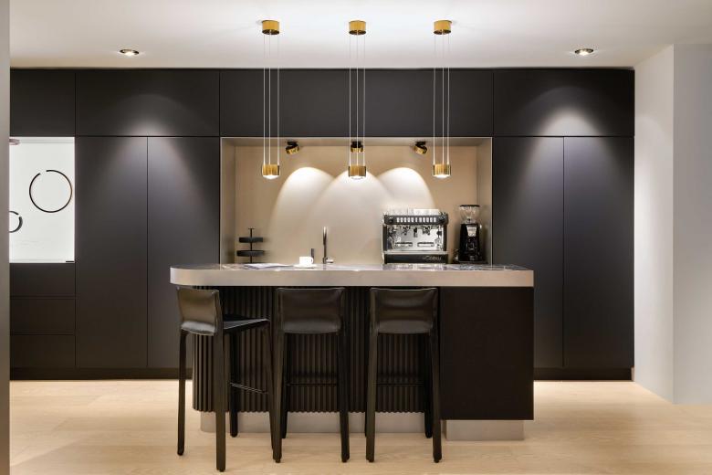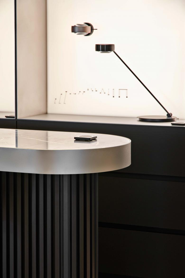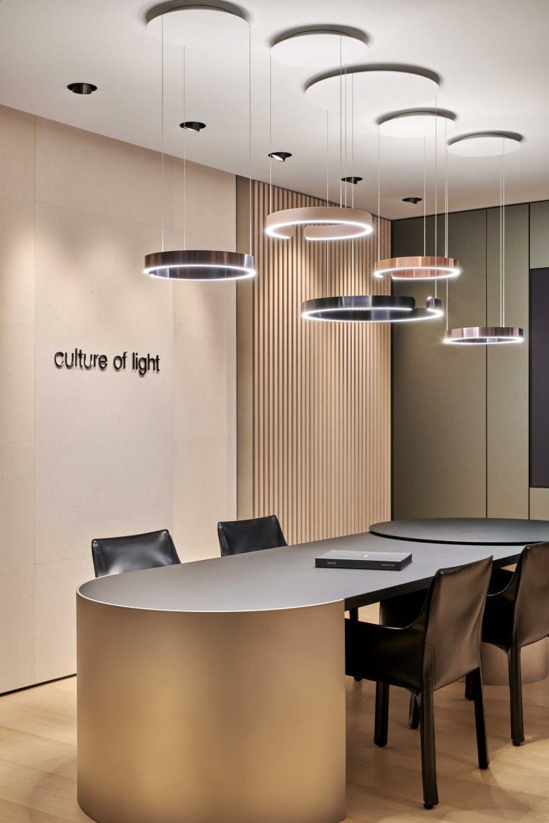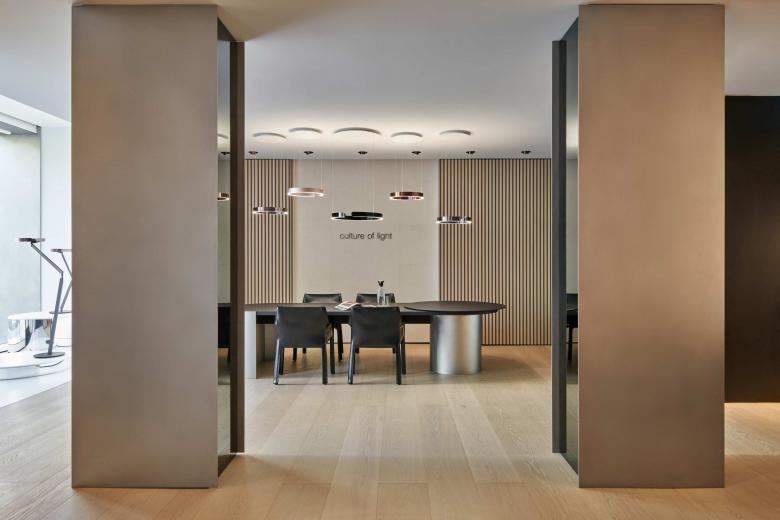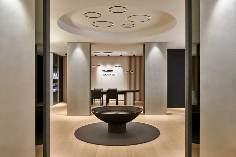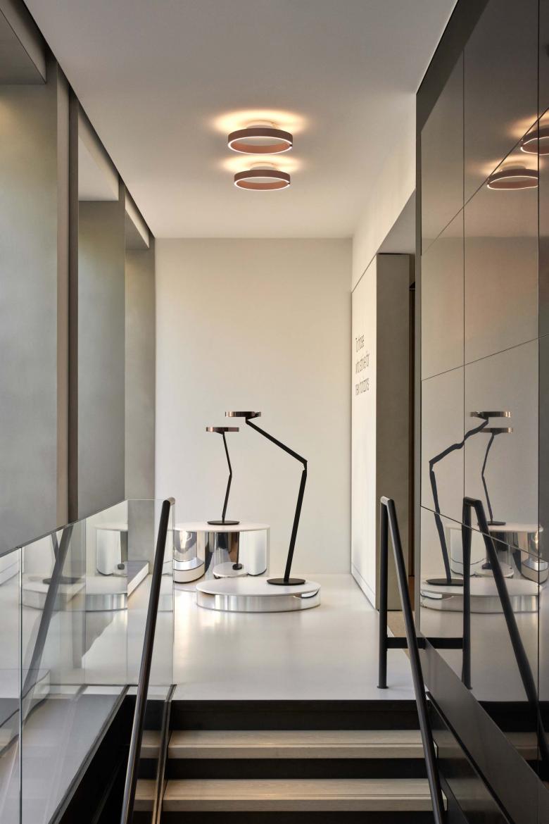 Occhio’s first London store welcomes passers-by with a generous window space, designed as an open white cube for dazzling displays. Existing columns, clad in stainless steel and tinted mirrors, divide the ground floor into areas to explore products, consult an expert, or have a coffee at the bar. A luminous staircase leads to the Light Lab and bathrooms with an exhibition in the antechamber.