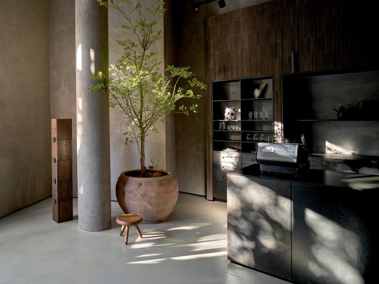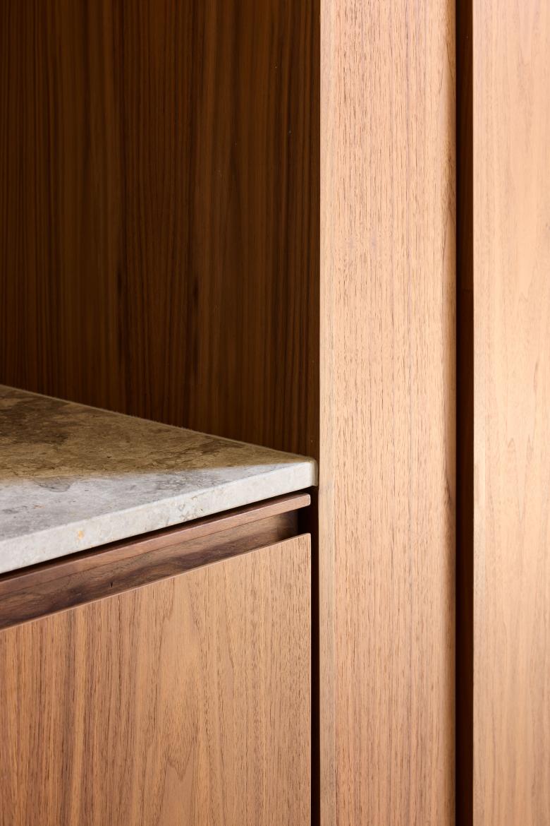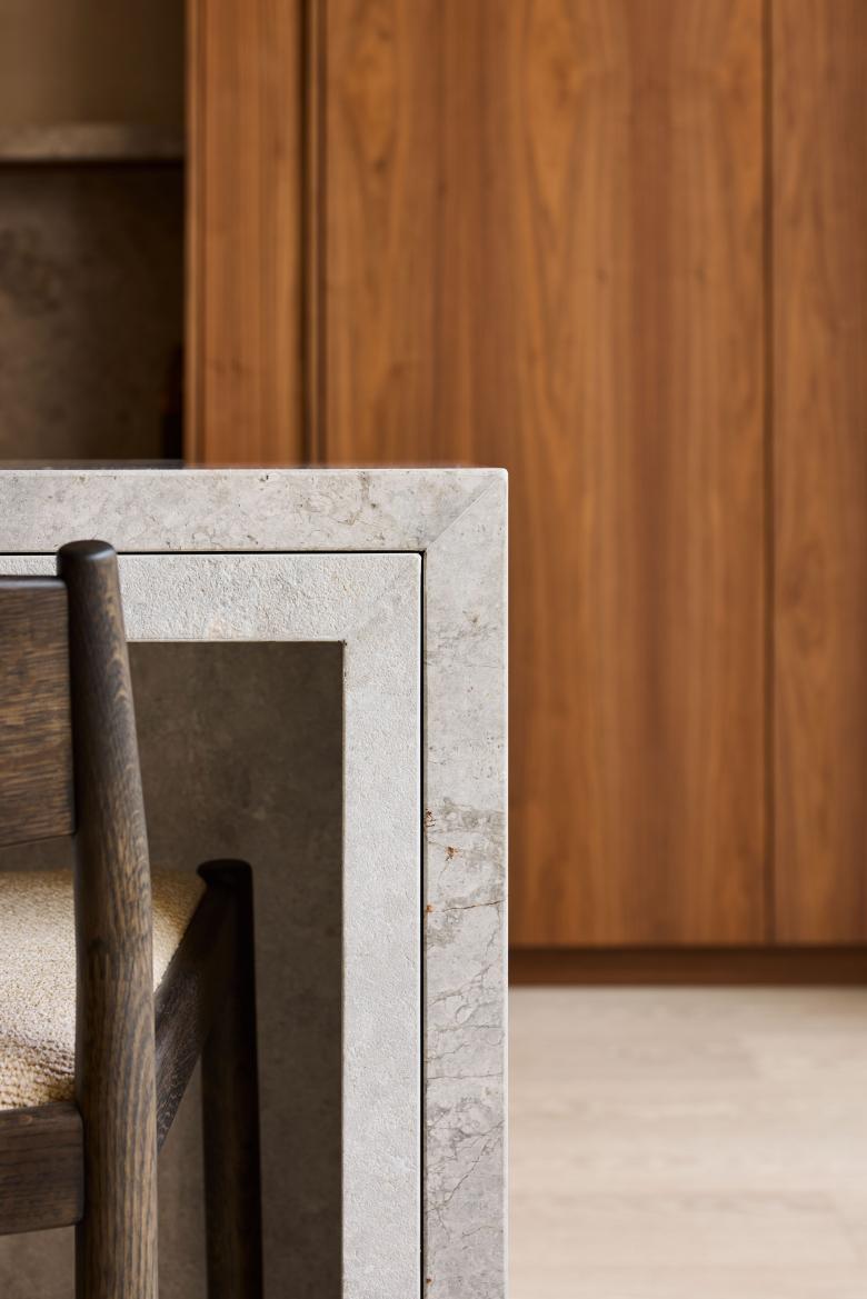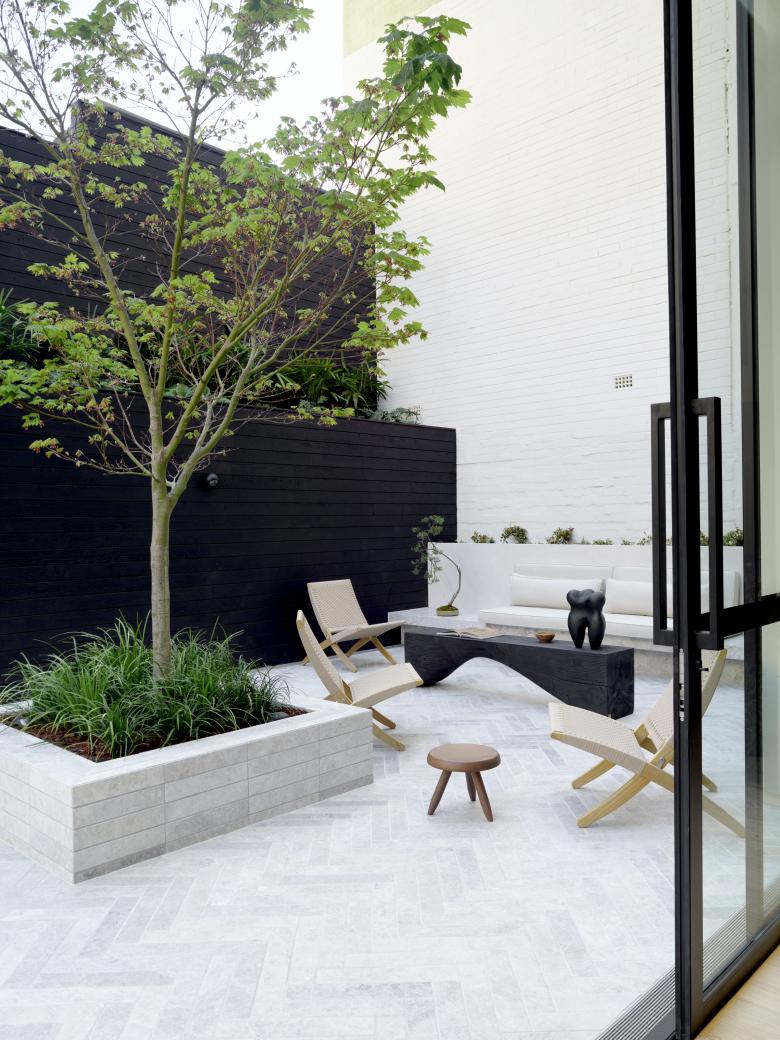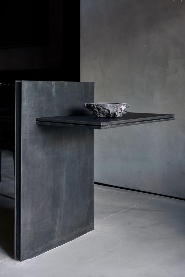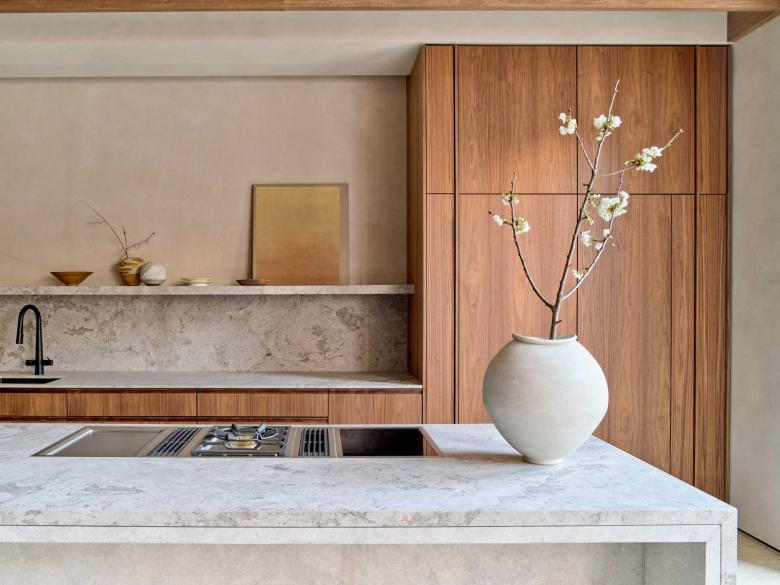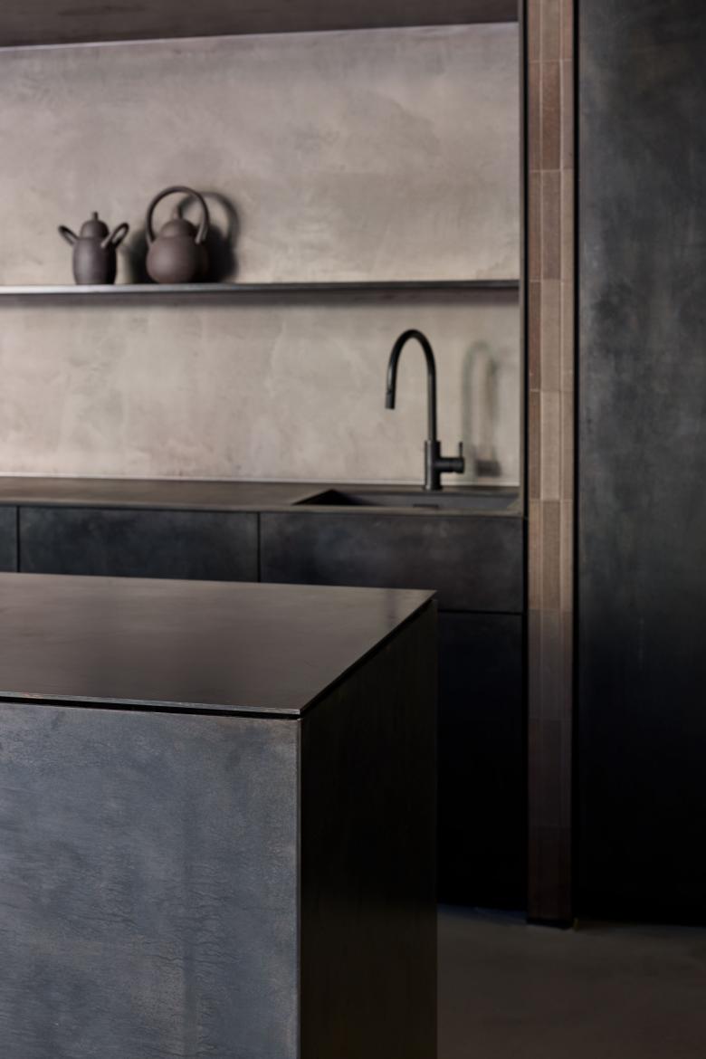 Surry Hills is loved for its lively bars and cosy homes, a contrast expressed here in two atmospheric areas. An urban hub with steel-cladded wine bar, which invites to socialise, is followed by a secluded but bright dining room with warm, wooden accents and a kitchen island of sandblasted stone. The comfort of a living space is also felt in the courtyard.