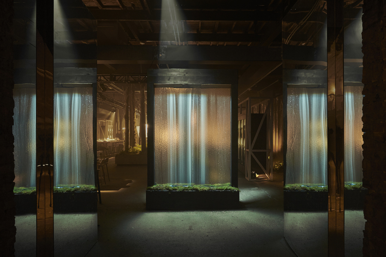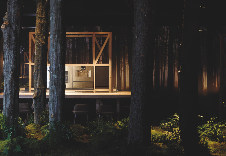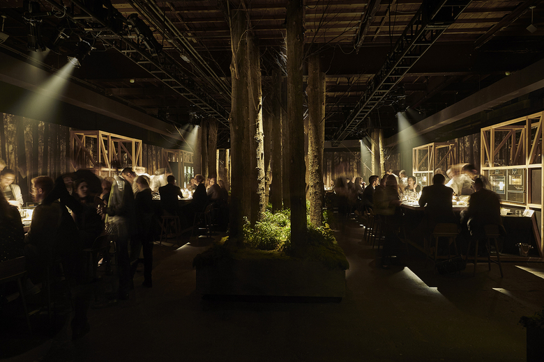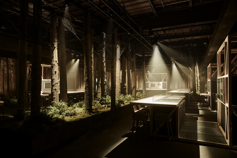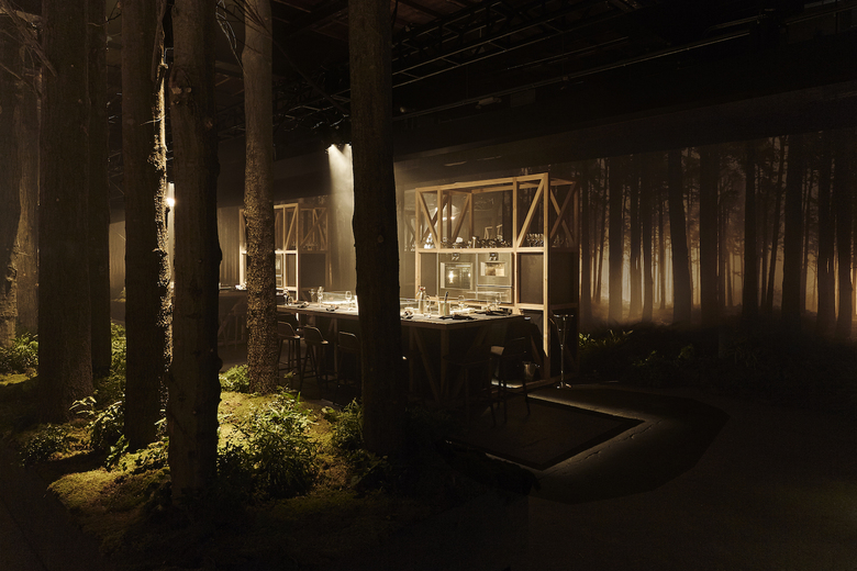 Stepping through time, the guests are lead to a cocktail reception. Reminiscent of a blacksmith shop, the setting is completed by a real blacksmith. The fire and the hammering as he forges nails, culminates in the presence of the contemporary Gaggenau EB 333. The main chapter of the dinner starts as the guests step through a black curtain to see a floor to ceiling waterfall which encircles them as they pass through a short corridor of mirrors. The guests find themselves midst of a Black Forest setting, with the soothing sounds of rushing water and intermittent chirping of woodland birds. The air is cool and misty, the room dark with streaks of light cutting through tall trees, smells of rich soil and wood wrap you; a surreal forest that feels a thousand miles away. Bedded in moss, six dinning stations find their place within the forest. Here the chefs prepare a menu wich marries the rich, earthy flavours of the Black Forest. Under the culinary direction of three Michelin star Chef Daniel Humm food is prepared right in front the plates and immediatly enjoyed.