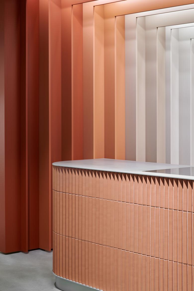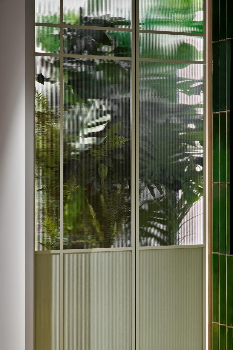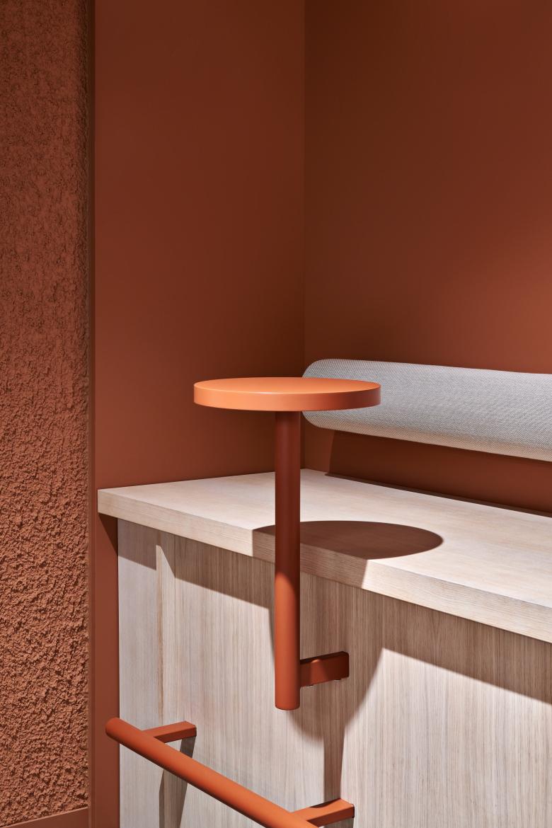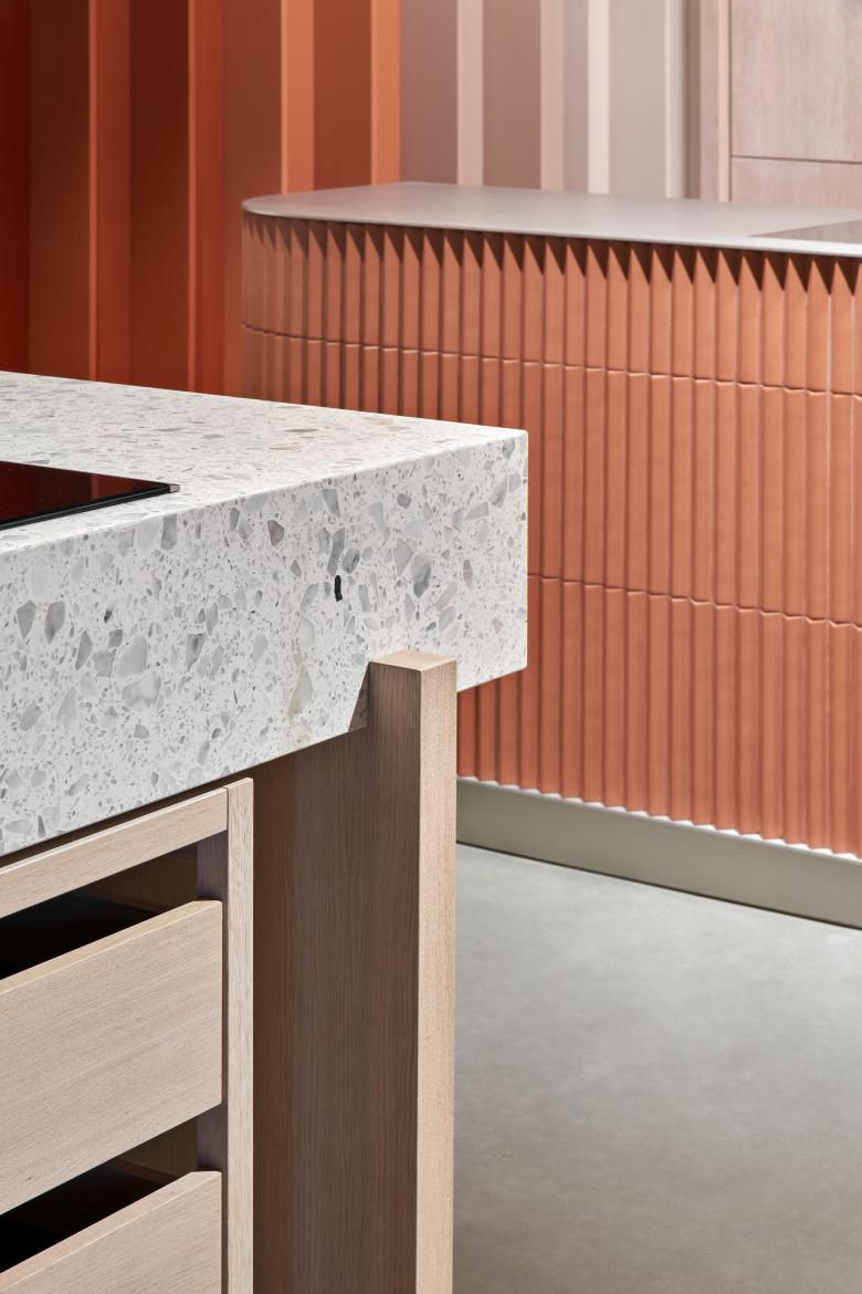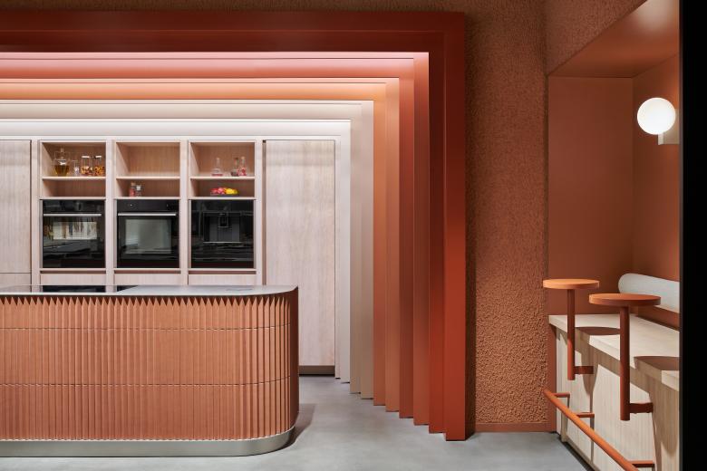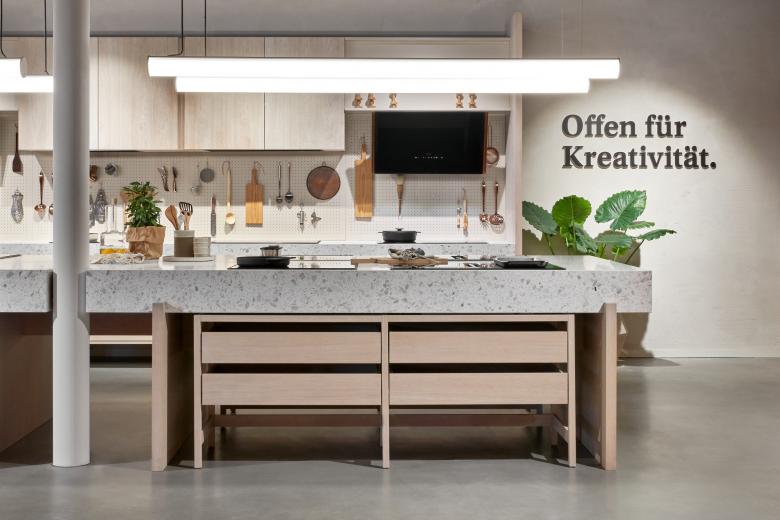 To relay a lively exuberance, various spatial scenarios were created. A setting reminding of a gallery shows products with colourful frames. The vivid Food Atelier with stage-like surround inspires live cooking sessions, next to a playful workshop space in which tools can be arranged. The frosty “orangerie” with plants— visible through rippled glass—hosts the fridges, followed by a long table and kitchen conveying the joy of joined cooking and dining.