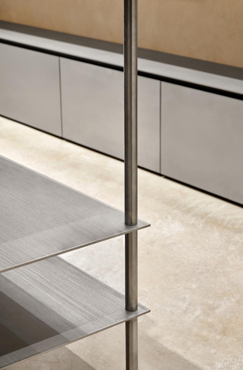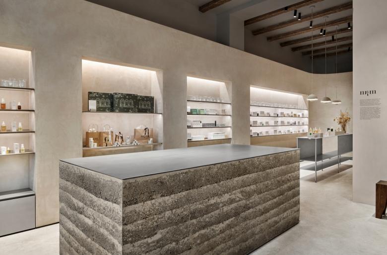 In this homely skincare store, nature meets science and raw meets refined. Clay clad walls, a rammed earth counter, and a lime-based screed floor reflect the company’s use of natural, locally sourced ingredients. Stainless steel product shelves and table tops provide an accent of contrast and refer to the scientific evidence underlining all nkm recipes.