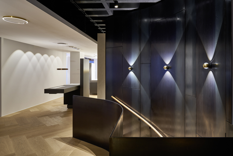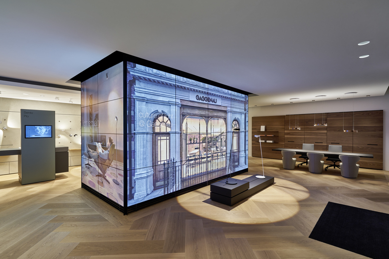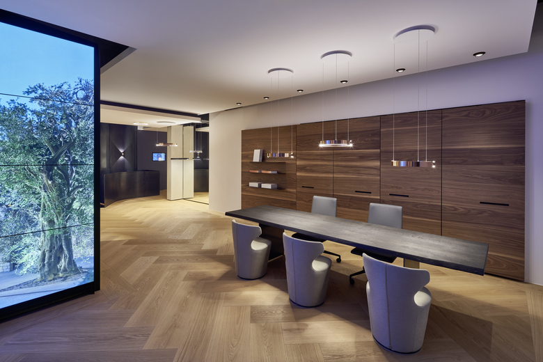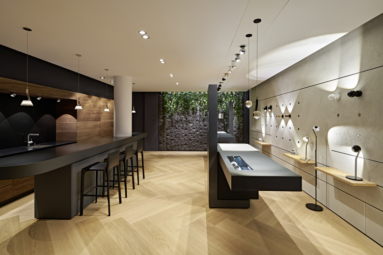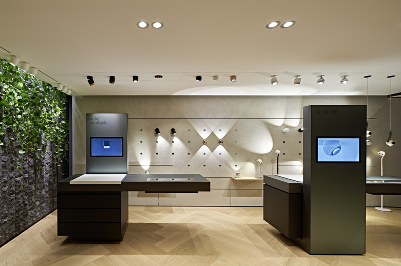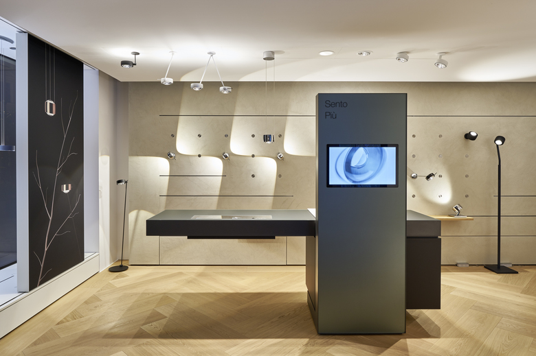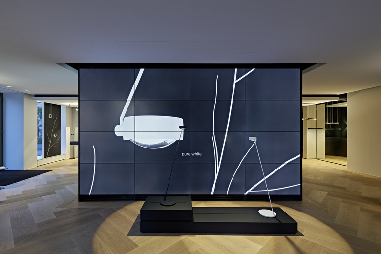 Die Präsentation der Leuchten und Lichtsysteme von Occhio ist vollständig in die Wände und Decken integriert und ermöglicht auch ein flexibles Visual Merchandising nach dem Motto Plug-and-Play. Der Kunde orientiert sich visuell durch die im Raum angeordneten „Space Stations“, an denen verschiedene Leuchtenfamilien präsentiert werden und wird intuitiv durch den gesamten Produktbereich geführt.