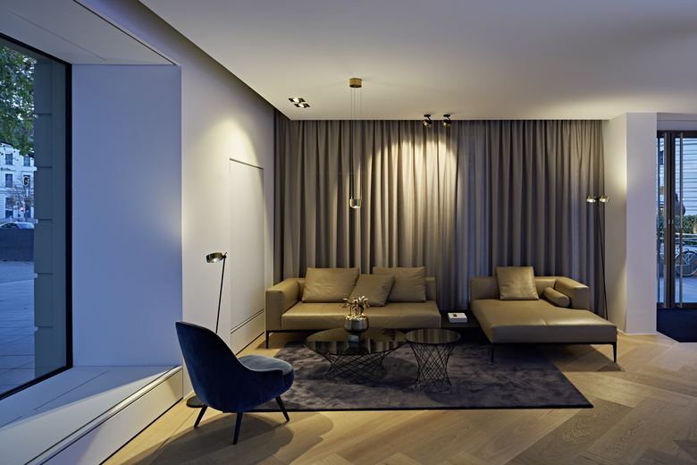 Beim Betreten des Raums erinnert auf den ersten Blick nichts an einen Retail Store. Die Stimmung spiegelt den Eindruck eines modernen und kultivierten Wohnambiente wider, das von wertvollen Materialien und einer weichen Tonalität bestimmt wird. Die Leuchten sind auf natürliche Weise mit den sorgfältig ausgewählten Möbelstücken arrangiert und schaffen ein atmosphärisch vereinnahmendes Raumerlebnis.