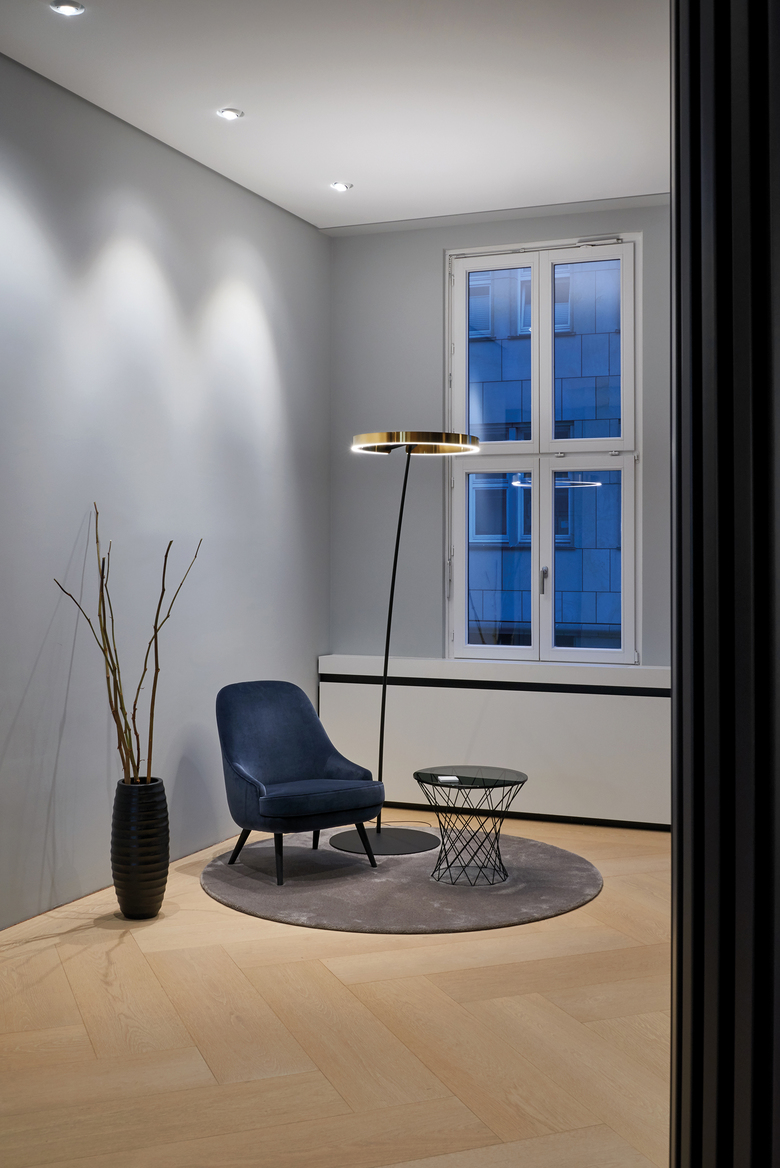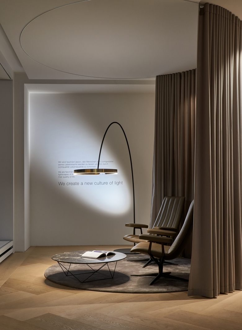 Auf über 600 Quadratmetern und zwei Ebenen taucht der Besucher in eine Erlebniswelt ein, in der die Designleuchten in realistischen, hochwertig ausgestatteten Szenarien präsentiert werden. Die Occhio-Philosophie einer „New culture of light“ verbindet dabei Design und Funktionalität auf eine Weise, in der Licht und Emotion eine Symbiose eingehen. Die Architektur transportiert diese Botschaft, indem sie die Produkte in authentische Kontexte komponiert, ohne ausgestellt zu wirken.
