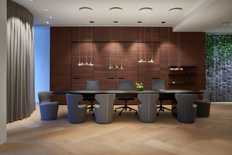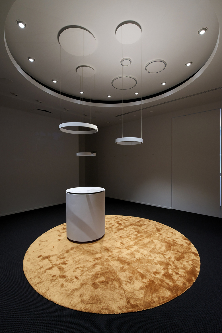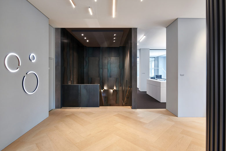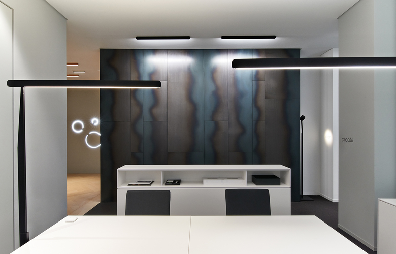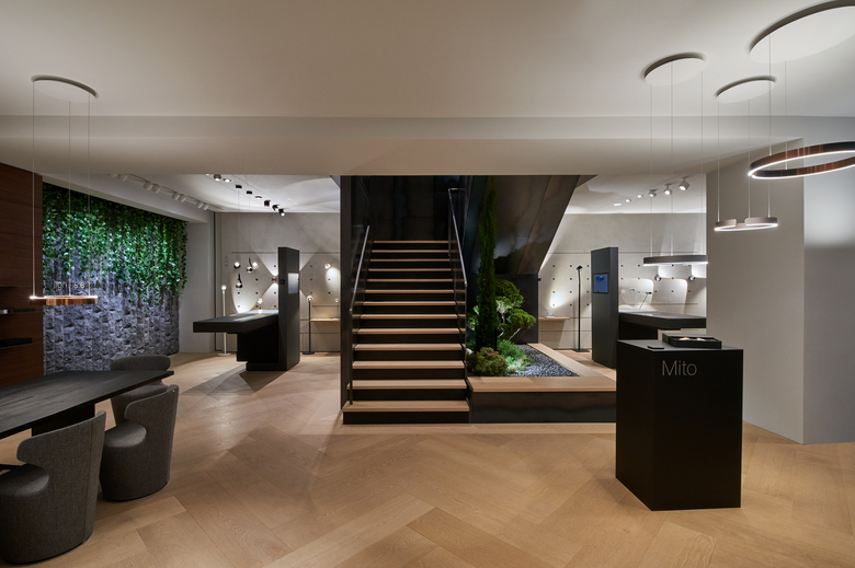 Das Erdgeschoss empfängt mit Wohnambiente sowie verschiedenen Product Spaces. Eine kubische Video-Wand durchbricht die Decke des Erdgeschosses und transformiert sich im Obergeschoss zu einer Bar. Diese nimmt die kubische Grundform zwar auf, stellt aber etwas Eigenes, Neues dar. Eine Treppe führt von unten ins Obergeschoss mit einer großen Lounge, Co-Working-Space, Büros und Besprechungsinseln. Auch ein Academy- Bereich mit Light Lab und der Dachgarten zur Präsentation des Außenleuchten- Programms sind hier untergebracht: Die Grenzen zwischen Innen und Außen verschwimmen, das Wechselspiel zwischen innerer Emotion und Funktionalität findet gestalterischen Ausdruck.