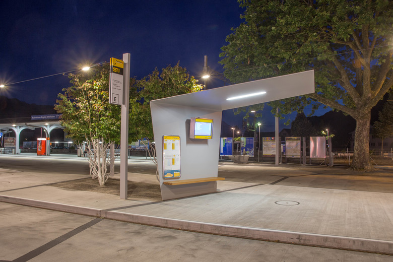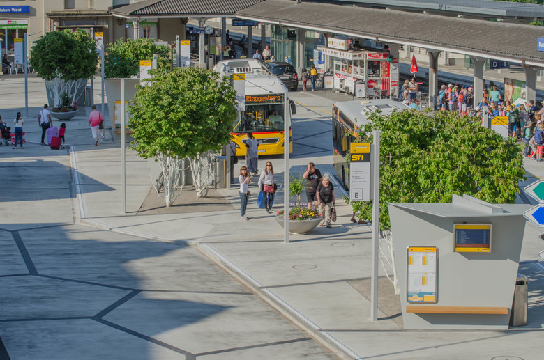 Die Funktion vom Busbahnhof wird optimal sichergestellt, ohne den städtischen Freiraum thematisch zu dominieren. Den Bereich zwischen Geleisen und Bahnhofstrasse lesen wir als Übergang zwischen Bahn und Stadt, als Ort, wo sich der Reisende orientiert, informiert, ausrüstet, verpflegt oder einfach umsteigt. Um das auch gestalterisch ablesbar zu machen, haben wir den Bereich vor der Strassenkante bis zur Perronkante mit einem einheitlichen Belag versehen. An Ort betonierte Flächen, mit von den Gebirgsstrukturen abgeleiteten Formen, bespielen den ganzen Bereich wie Puzzleteile. Die Anlegekanten des Busbetriebs fügen sich selbstverständlich in das Muster ein. Die Platzmitte bildet das Busperron. Es ist möbliert mit vier kleinen Unterständen mit zugeordneten mittelhohen Baumgruppen und mit einer linear abgespannten Beleuchtung.