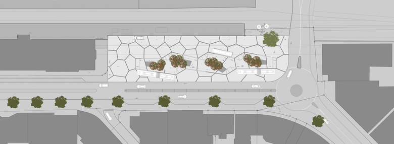 Der Westbahnhof hat einen offenen und repräsentativen Platz erhalten. Darauf erlebt man die umgebende Bergkulisse intensiv. Die freie Fläche ist übersichtlich gestaltet. Wie bisher begrenzen das Aufnahmegebäude, das Perrondach, das Bankgebäude und die Häuserzeile im Osten diesen Ort. Einzig die Bäume werden näher zur Häuserzeile geschoben und können so zusammen mit den Neupflanzungen in der Bahnhofstrasse, als Filter zur Stadt gelesen werden. Die bestehenden Gestaltungselemente werden weitergeführt, die Trottoirzone verbreitert. Die Häuserzeile wird damit wichtiger und ermöglicht den Erdgeschossnutzungen die Vorzone bespielen zu können.