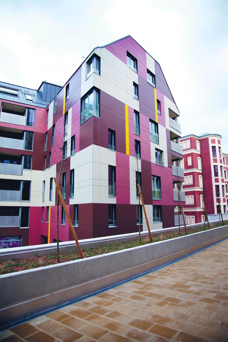 Die terrassierten Hofniveaus und belichteten Sockelzonen mit Wellnessbereichen, Spiel- und Fahrradräumen ergänzen den Freiraum und fungieren als Bindeglied der einzelnen Bauten. In den obersten Etagen befinden sich Wellnessbereiche mit Dachterrassen und intensiv begrünten Dachgärten. Die Fassadensprache ist von reliefartig entworfenen Verflechtungen geprägt. Die verglasten Flächen der Kinderwagen- und Fahrradräume, Waschküchen und Eingänge prägen die Leichtigkeit und Übersichtlichkeit der Anlage.