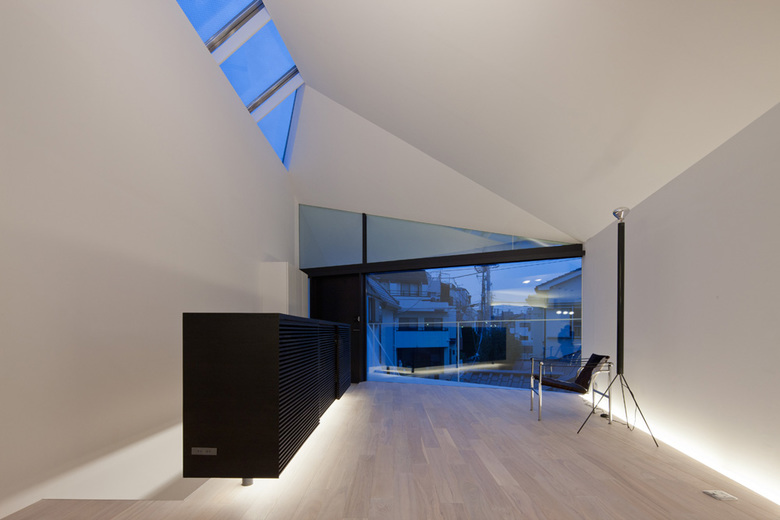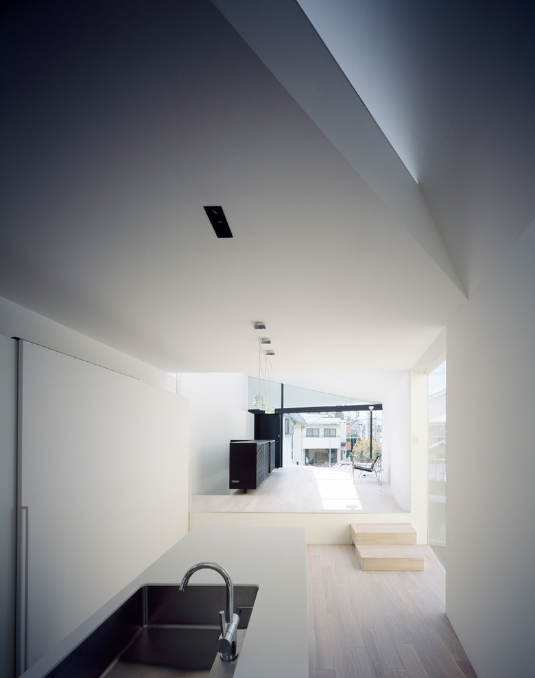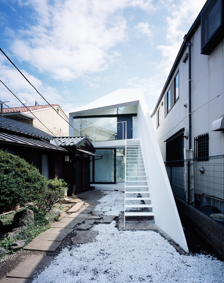 今回は、本敷地の特徴である長いアプローチの先端を中間領域として機能させることで「第三の空間」をテーマにした。新居のエントランスはアプローチ階段を経た2階とし、1階には写真家のご主人のスタジオのエントランスを設けることで実家とスタジオ、新居の間に三者のアプローチ広場が生まれた。旧家の濃茶の外壁とコントラストを生みだす白壁や手前に大きく羽根を広げたアプローチ塀、舞台となる階段などが舞台装置として機能している。