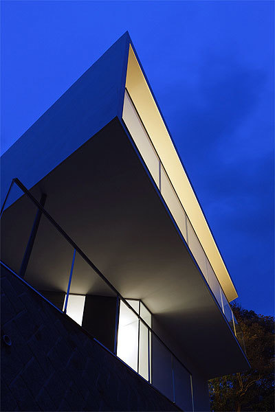 RC造の基壇に鉄骨造の白い箱がずれながら搭載された外観に木造の屋根が架かっている。1階北側の静かなアトリエに面する中庭は高塀で囲われ、プライバシーを配慮。東側には水廻りと一体になった寝室を設け、森の緑景がリゾートホテルのような非日常性を演出する。1階とは対照的に、2階にはファミリールームの大空間が広がる。計算された開口部配置によって周辺の森や目前に広がるパノラマの景色が切り取られ、壁面には収納や水廻りが整然と造りつけられている。鉄と木で構成した五角形の大屋根は、大胆かつ繊細なディテールワークでこの大空間の美しさに一役買っている。自然環境との共存、開放性と閉鎖性のバランスが本住宅のテーマである。