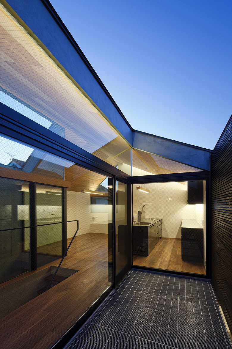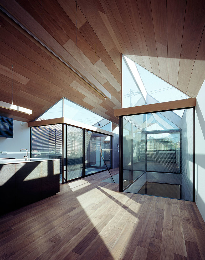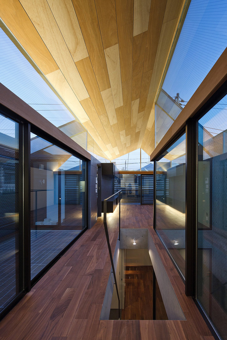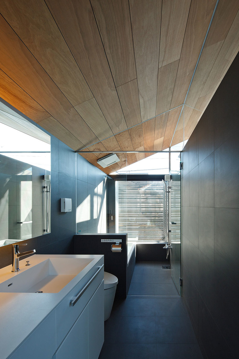 主寝室や子供室などプライベート空間が中心の1階フロアとは対照的に、2階にはファミリールームを配置。切妻屋根のおおらかな平面形状は2つの中庭で切り取られた「くびれ」が特徴だ。ハイサイドガ ラスを介して景色や光を内部に取り込むことができるため大変開放的である。リビング横にはタイル貼壁面を境に水廻りの一室空間を配置。透明ガラスの高窓を介して木張りの天井が連続する構成にすることで、2室が分断されることなく 大らかな空間が広がっている。内部から覗く木製横ルーバーが空間の程良いアクセントとなり、プライバシーも十分に確保。室内の素材をシンプルにすることで空間にはストイックな統一感に加え、コンクリートと木材の組み合わせや切妻屋根のモチーフが独特の温かみを生みだしていると言えよう。住宅密集地であることを忘れさせるこれらのデザイン手法は都市的ソリューションの代表格と言えるだろう。