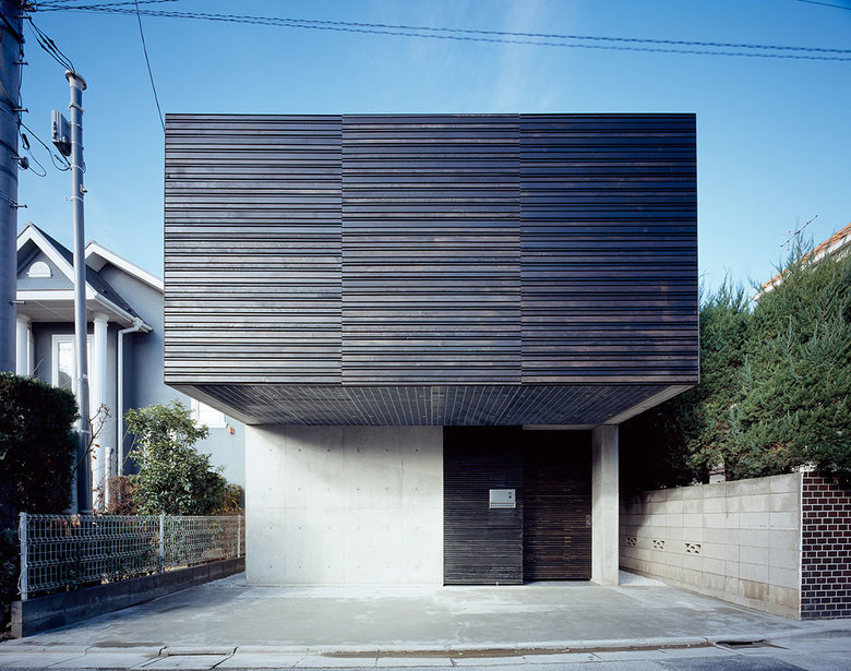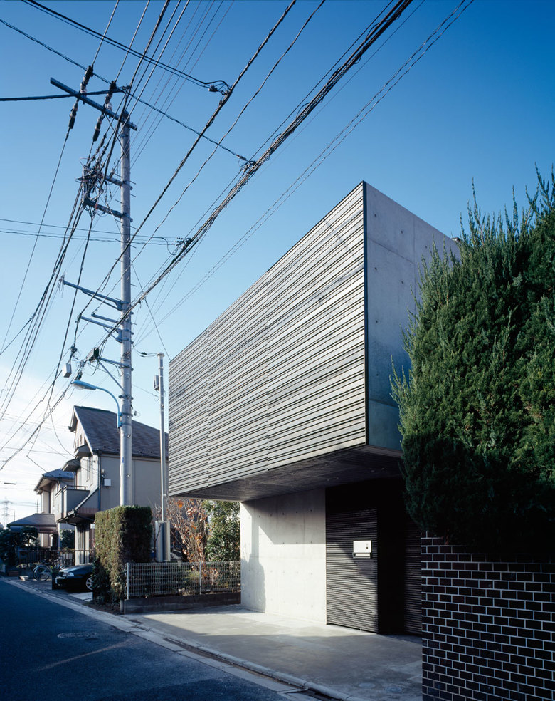 眼科医のご夫婦は心おきなく趣味の音楽鑑賞を楽しめる家を建てるために、閑静な住宅街に間口が小さく奥行きの深い土地を購入。RC造外断熱工法で 設えた地下のスタジオには中庭を設け、遮音性を配慮した二重ガラスを使用することで騒音問題を解決している。ドライエリアを介して注ぎ込まれる光のおかげで、地下とは思えないほど居住性が高い空間が実現している。ピロティガレージとエントランスを確保するために上部がせり出したバルコニーの手摺にはランダムな見付の木製横ルーバーを採用した。閉鎖的なデザインでありながらも十分な通風を確保。道路からの見上げの視線を遮断しながらファサードのアクセントを創りあげている。