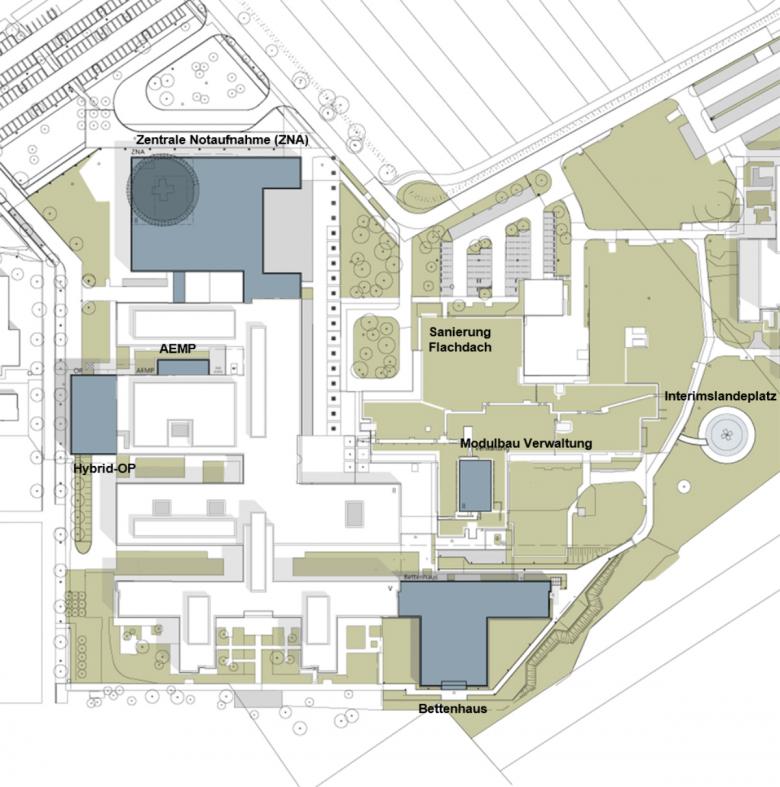 Zentralen Notfallversorgung, einer Kurzliegereinheit, einem CT und einem Röntgenraum, sowie einer Notfallpraxis.