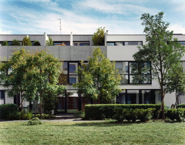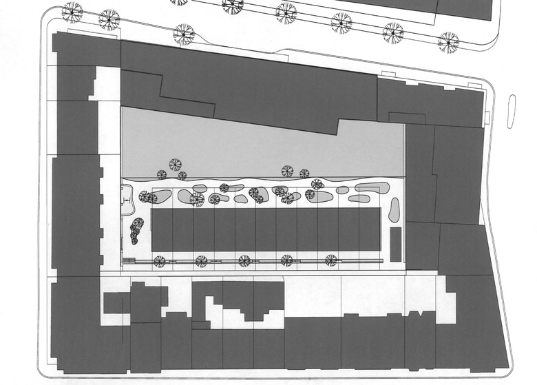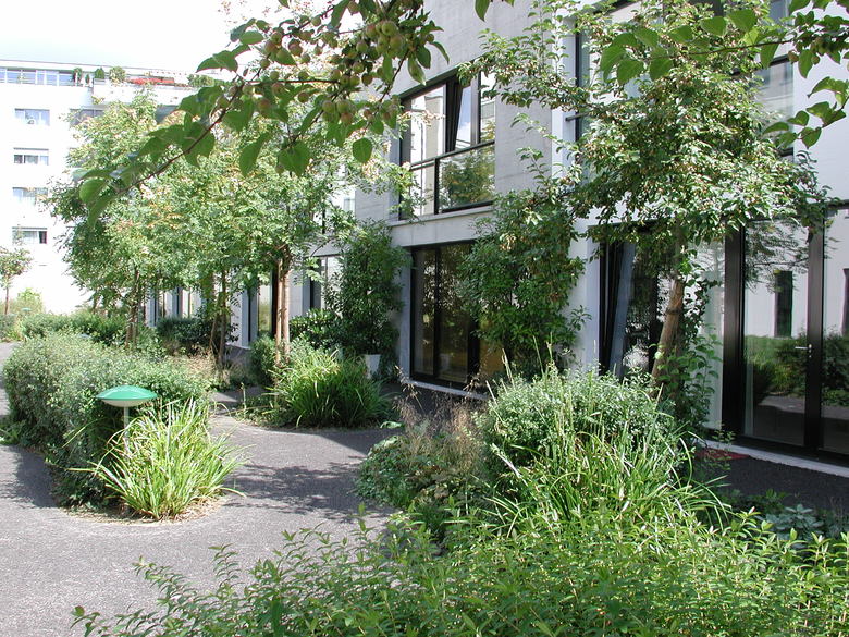 Im Hof einer geschlossenen Blockrandbebauung ermöglichen die elf Wohn- und Atelierhäuser eine neue Form der Verbindung von Wohnen und Arbeiten. Gleichzeitig interpretieren sie innerhalb des gründerzeitlichen Stadtmusters das Thema des Hofeinbaus neu. Auf der Seite des Erschliessungsweges bildet ein Niveausprung die Zonierung zu den Gebäuden und den Eingangsbereichen. Auf der Seite Richtung Hotel Dorint wurde auf die Bildung von privaten Einzelgärten verzichtet. Vielmehr wurde eine zusammenhängende «Kleinlandschaft» gebildet. Der Hartbelag im Hofbereich ist von Pflanzeninseln unterbrochen und findet so einen fliessenden Übergang in die Wiesenlandschaft. Die Wiesenfläche ermöglicht Weite und Distanz zum Hotel Dorint und verleiht dem Hof eine «grüne Atmosphäre».