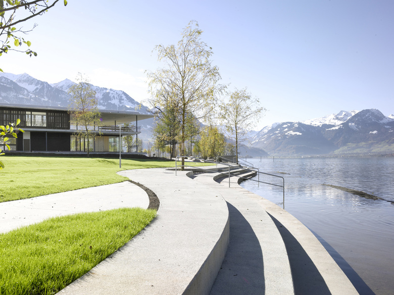 Die Uferzone ist im Badebereich mit Sitzstufen, Stegen und Badeinsel gestaltet. Am Kopf des Lido-Gebäudes fassen Ufermauern ein "Belvedere" mit Aussencafé, während die restlichen Bereiche einen naturbelassenen Übergang zu Naturschutzgebiet und See schaffen.